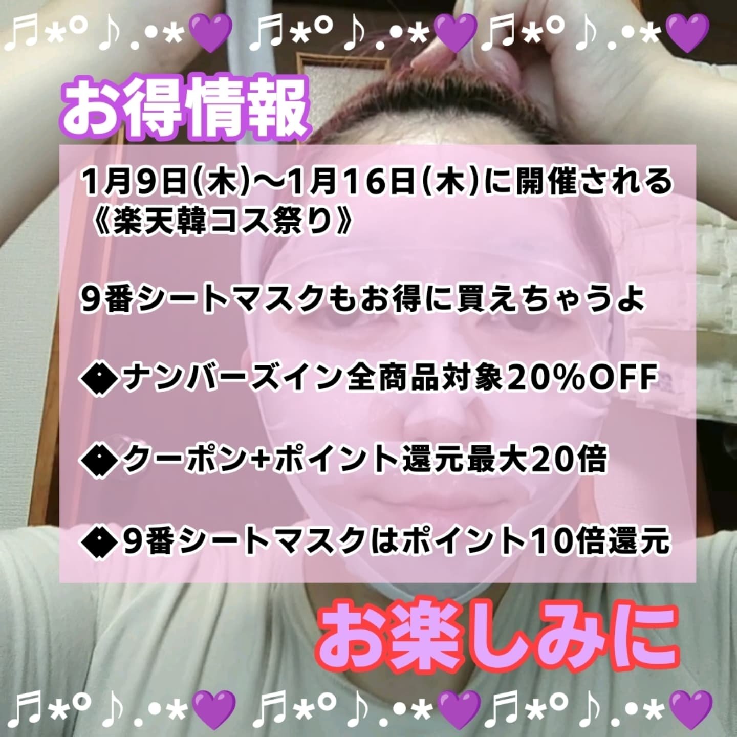 9番NMNバイオリフトラッピングマスクは上下にわかれたマスクになっていて、柔らかいもちっとしたシートが肌に密着してくれます。 更に小顔圧迫バンドにリフトバンドが着いてるのでより1層密着されてマスク後スッキリ感あり良い感じ🙆♀️ 1/9(木)〜1/16(木)に開催される『楽天韓コス祭り』で9番シートマスクがお得に購入できるみたいだよ♡♡