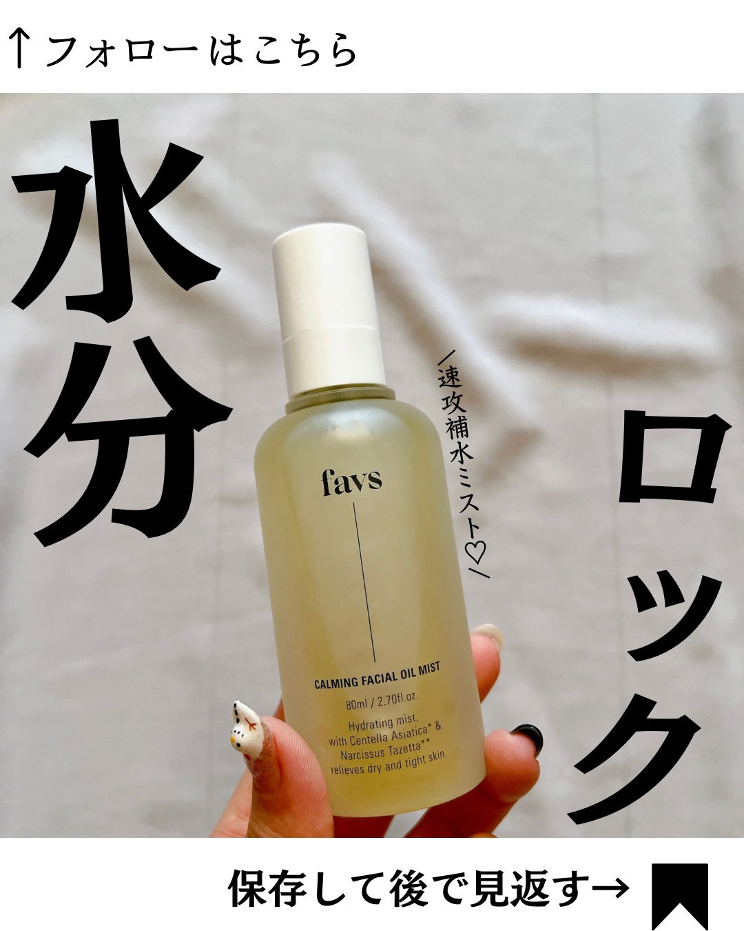 - POINT01:水性と油性の「W保湿」で、うるおいの「質」をキープ。 水分層とオイル層の2層に分かれ、オイル層には5つの植物性オイル*¹を配合。 肌を保護するだけでなく角質層のすみずみまで浸透し、エイジングケア*²をサポート。 乾燥した肌に必要な水分と油分を与え、内側からうるおいに満ちた輝くような肌へ導きます。 *¹オリーブ果実油、ベニバナ種子油、ブドウ種子油、マカデミア種子油、ホホバ種子油(すべて整肌成分) *²年齢に応じたお手入れ POINT02:オイルインでありながら、スッと肌になじむこだわりのテクスチャー。 favsベストセラー製品のカーミングフェイシャルミストをベースに、水分を保有する能力と揺らいだ肌*¹をすこやかに整える機能にすぐれたスイセンのエキス*²や月見草エキス*³、カテキンやフラボノイドを含む緑茶エキス*⁴など植物成分を厳選配合。 豊かなうるおいを与え、保湿+エイジングケア*⁵のダブルの力で肌をサポートします。 *¹乾燥や紫外線により一時的に不安定な肌状態 *²フサザキスイセンエキス(整肌成分) *³メマツヨイグサ花エキス(整肌成分) *⁴チャ葉エキス(整肌成分) *⁵年齢に応じたお手入れ POINT03:肌に触れるたびに広がり、心地よいリラックス感を。 香りには肌へのやさしさを考慮して、ラベンダーの精油*¹を使用しています。 心地よい香りで日々のリフレッシュする時間にも。 メイクの上からはもちろん・ボディミストとしてもお使いいただけます。 *¹ラベンダー油(整肌成分) 〈特徴成分〉 ・オリーブ果実油(整肌成分):肌にうるおいを与えるオイル。肌荒れを防ぐ効果も。 ・ベニバナ種子油(整肌成分):ハリのある肌へ導くオイル。肌キメを整える効果も。 ・ブドウ種子油(整肌成分):肌の保水力・浸透力*をサポートします。 ・マカデミア種子油(整肌成分):ナッツの王様とも言われるマカダミアナッツ由来のオイル。 角質層のすみずみまで浸透するため、肌なじみが良くエモリエント効果も。 ・ホホバ種子油(整肌成分):肌になじみやすい性質のあるオイル。 肌バリアをサポートし、しっとりと滑らかな肌へと導きます。 ・フサザキスイセンエキス(整肌成分):12月~2月にかけて開花する、耐寒性の強さを持つ植物。 肌をすこやかに整えてうるおいを与えます。 ・チャ葉エキス(整肌成分):肌を整え柔軟にする緑茶の葉から抽出。健康的な肌へサポートします。 *角質層まで