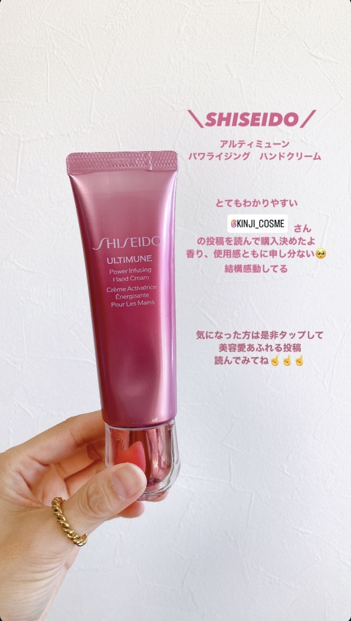 出会えてよかったリピ確ハンドクリーム! なめらかに肌に馴染んでベタつきなくサラッとしているのに塗り直しが減ったくらいうるおいが続くハンドクリーム! アルティミューンセラムと同じグリーンフローラルの心地よい香りに使うたび気分が上がるし上品なピンクのデザインも◎ 手の乾燥だけでなく花粉やほこりなどの空気中の微粒子の付着も防いでくれるのだそう!