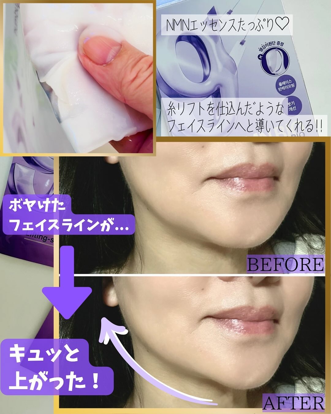 - ※2025年7月以降、商品パッケージ順次リニューアル。尚、これにかかる商品の返品・交換は承っておりません。 上下セパレートタイプの立体密着、マスクでぐいっと引き上げ*1! NMN*2バイオ圧縮カプセルと糸が溶け込んだ弾性3Dシートマスク *1使用方法のこと *2ニコチンアミドモノヌクレオチド(整肌成分) (※2025年3月下旬より全国のバラエティーショップで順次発売開始予定。)