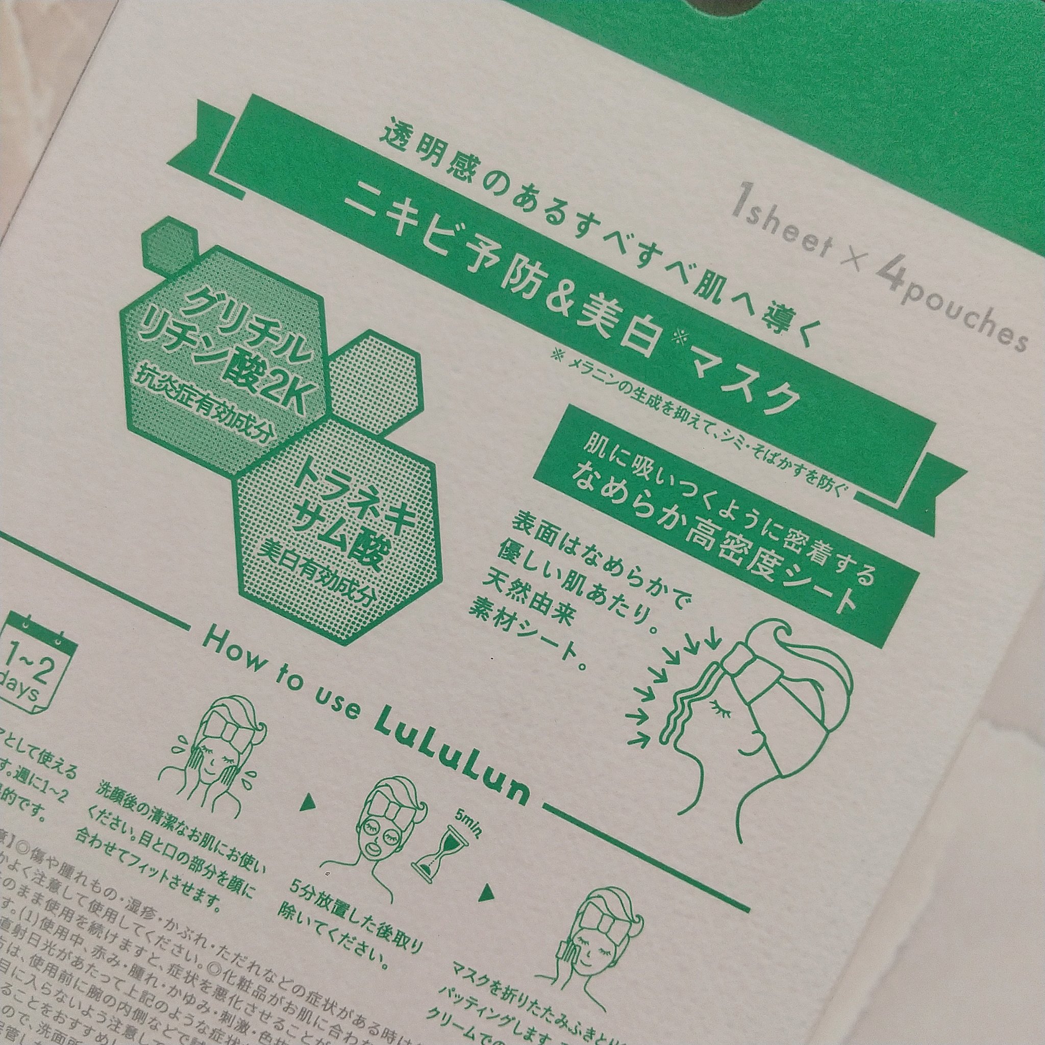 ニキビケアと美白か両方できる夢のようなパック🍀 グリチルリチン酸ジカリウム(抗炎症有効成分)と、トラネキサム酸(美白※1有効成分)のWの有効成分が配合されています。 やや厚みがあり、顔の余白がほとんどできないくらい、あらゆる顔のパーツにフィットするシート。
