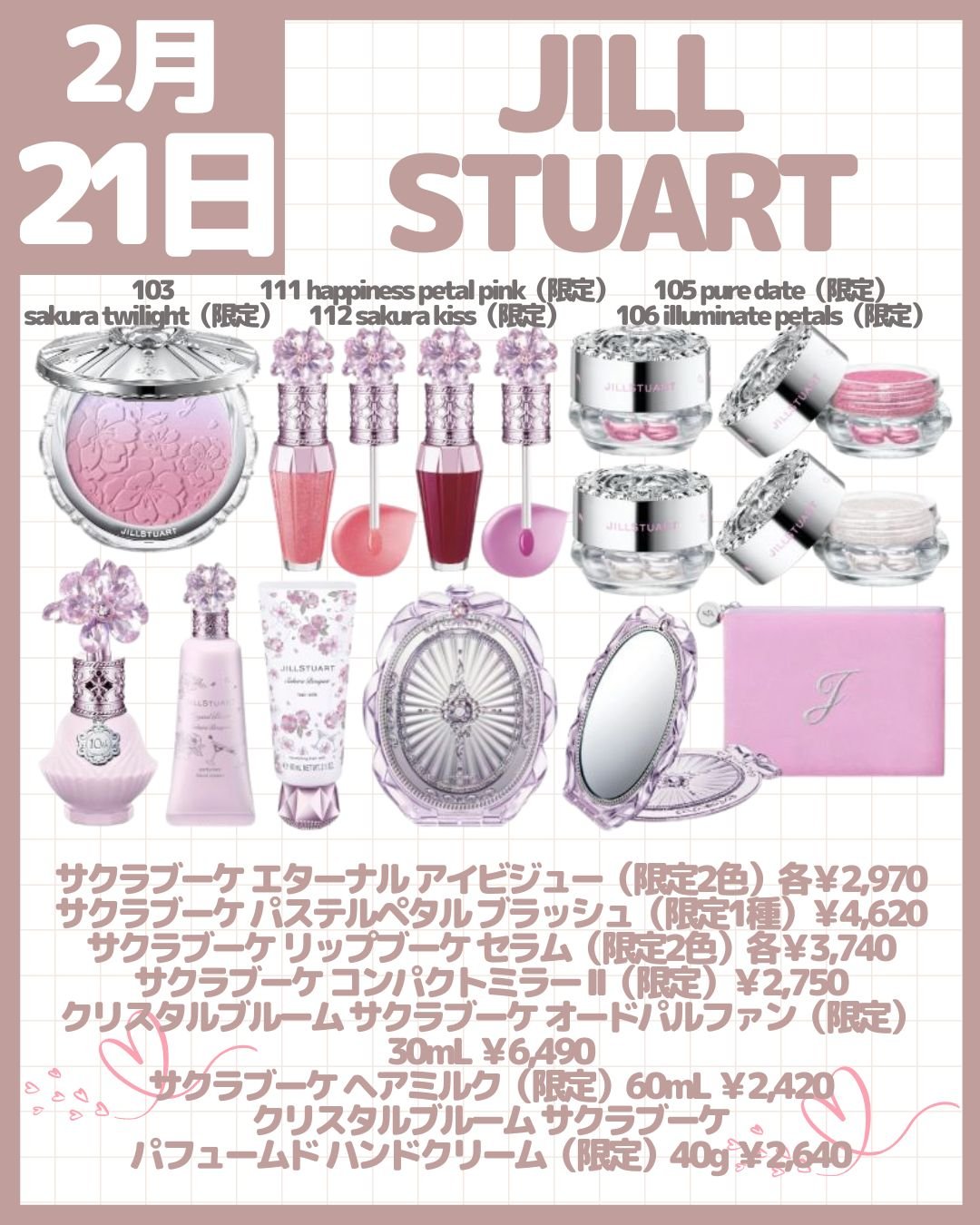 ジルスチュアートクリスタルブルームリップブーケ セラム ¥3,740 111 happiness petal pink<サクラブーケ> クリスタルブルーム サクラブーケ オードパルファン 10周年記念デザイン ¥6,270 ジルスチュアート サクラブーケ ヘアミルク ¥2,420