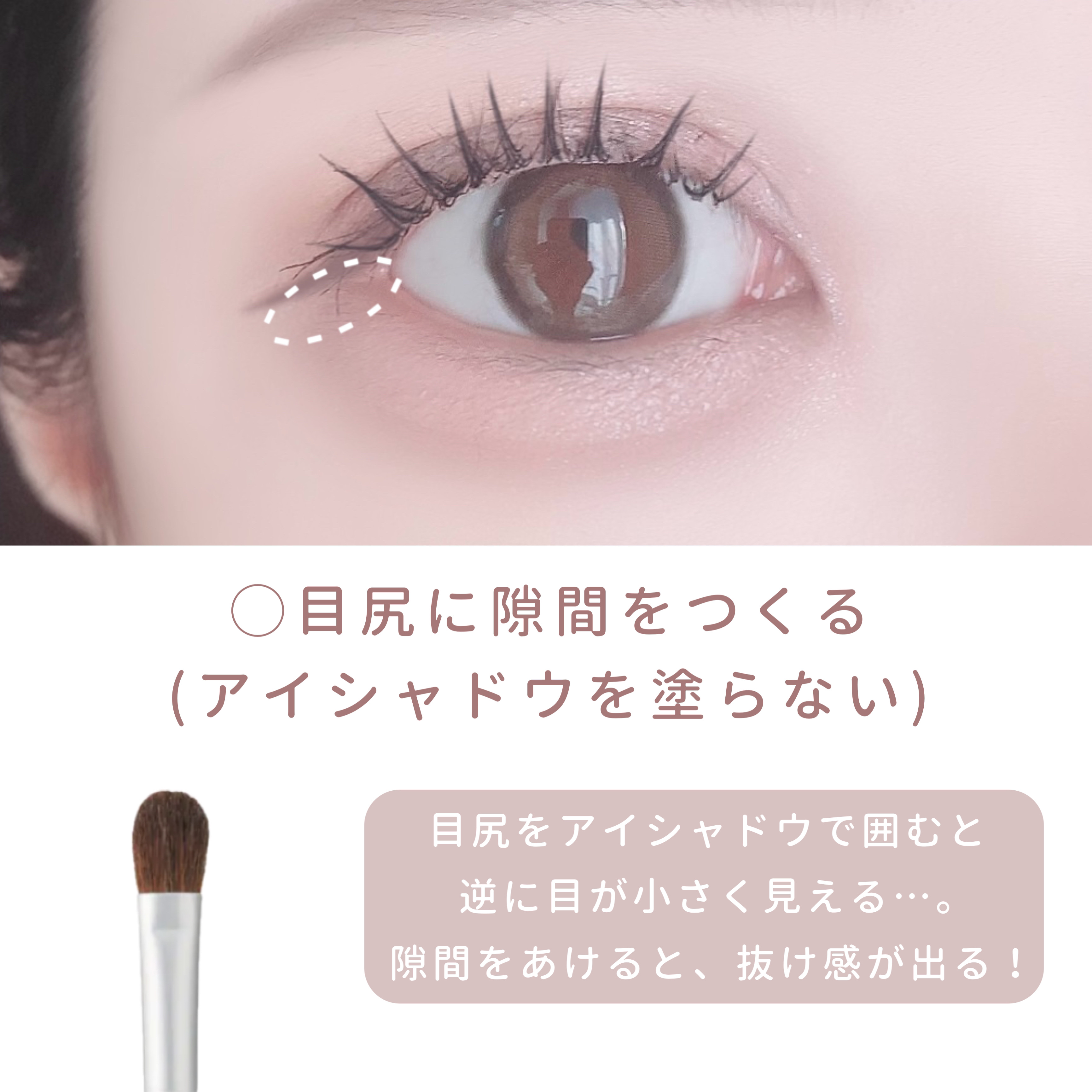 ・涙袋の影の部分まで、ベースを塗ることで縦幅がかなり強調されて丸目にみえる! ・アイシャドウの陰影とラメのハイライト効果で奥まった目に光を取り込んで出目っぽくみせる! ・淡いピンクのアイシャドウ、艶のようなラメ、細くて短いブラックアイラインが特徴 ・つり目を自然にいかせて、美人な雰囲気になれる! ・単色メイクは簡単そうに見えて難しいけど、ブラシを使うと綺麗なグラデーションになる! ・目の形によって中間色をどこまで入れるか変わるけど「目を開けた時に5mm見える」を基準にする