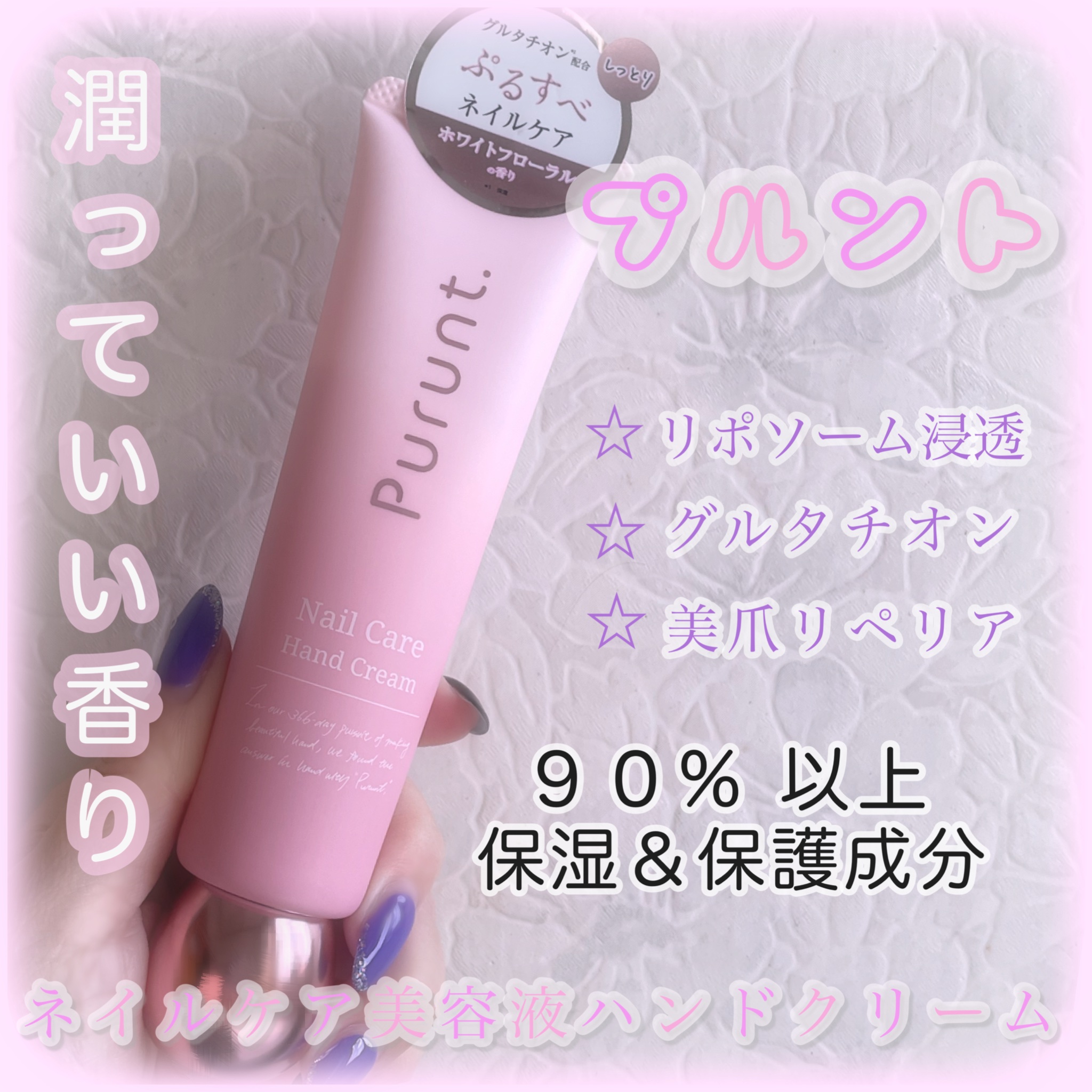 - 【美容室メーカーが366日かけて開発した、貯水ブースター処方のネイルケア】 手肌の角質層のすみずみまで行き渡る「リポソーム(美肌カプセル※1)に着目。貯水ブースター処方でネイルや指先までうるおいで満たします。なめらかで、ツヤのあるぷるすべ肌に。 ※1 生体組成成分リン脂質からなる微小カプセルのこと "半径2メートルの人をきゅんとさせる♡ふわんと香水ハンドクリーム" ◎リポソーム浸透*1 成分※1 ◎グルタチオン※2 ◎美爪リペア*2 成分※3 90%以上*3 保湿&保護成分 ●成分 ◎リポソーム浸透*1 成分※1 ◎グルタチオン※2 ◎美爪リペア*2 成分※3 90%以上*3 保湿&保護成分 *1 角質層まで *2 爪の保湿・保護を行うこと *3 水を含む ※1 セラミドEOP、セラミドNG、セラミドNP、セラミドAG、セラミドAP、水添レシチン、フィトステロールズ(全て保湿) ※2 保湿 ※3 加水分解ケラチン(保護) ●香り:ホワイトフローラルの香り ●特徴:ぷるすべネイルケア ●無添加・フリー処方:サルフェート(ラウレス硫酸Naなど)・石油系界面活性剤・エタノール ・PG・タルク・合成酸化防止剤・紫外線吸収剤・動物実験