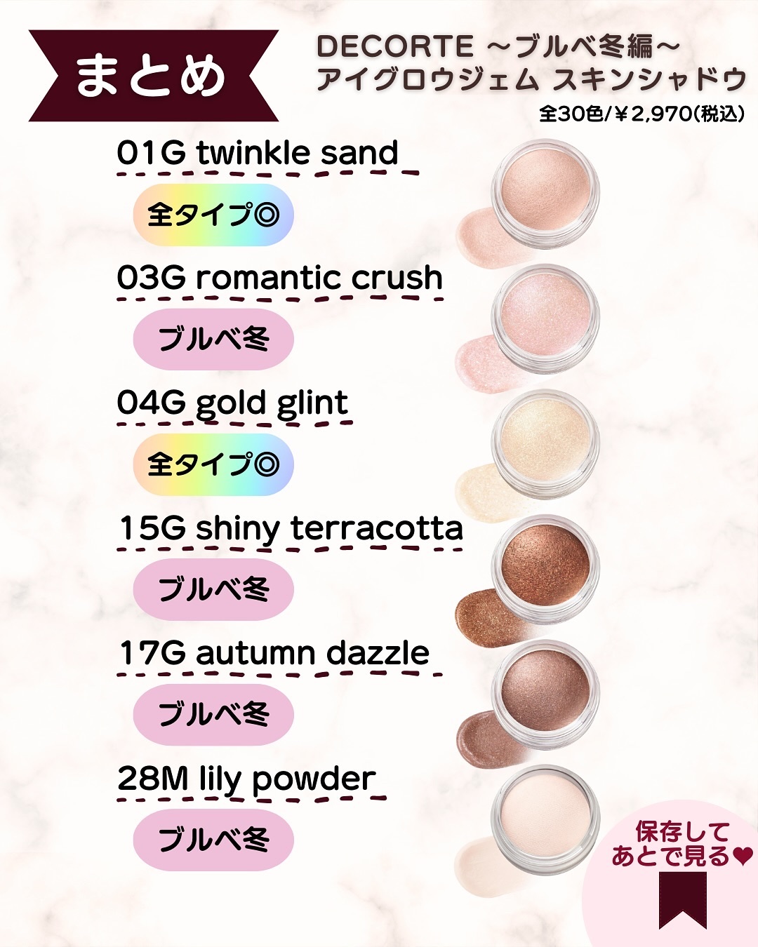 - <01G twinkle sand> シクロメチコン、合成フルオロフロゴパイト、ジフェニルジメチコン、(ジメチコン/ビニルジメチコン)クロスポリマー、イソドデカン、トリメチルシロキシケイ酸、ジメチコン、アストロカリウムムルムル種子脂、ゼニアオイエキス、ダマスクバラ花エキス、トコフェロール、マツリカ花エキス、レモン果実エキス、BG、BHT、TEA、(HDI/トリメチロールヘキシルラクトン)クロスポリマー、イソステアリン酸デキストリン、エタノール、エチルヘキサン酸セチル、キサンタンガム、シリカ、ジメチルシリル化シリカ、スクワラン、ステアリン酸イヌリン、セルロース、テトラ(ジ-t-ブチルヒドロキシヒドロケイヒ酸)ペンタエリスリチル、トリ(カプリル酸/カプリン酸)グリセリル、トリイソステアリン酸イソプロピルチタン、トリエチルヘキサノイン、ハイドロゲンジメチコン、ポリプロピレン、ミネラルオイル、合成ワックス、酸化スズ、水、水酸化Al、水添ポリ(C6-20オレフィン)、水添レシチン、麻セルロース、フェノキシエタノール、香料、オキシ塩化ビスマス、グンジョウ、マイカ、酸化チタン、酸化鉄 <02G dizzy mirage> 合成フルオロフロゴパイト、シクロメチコン、ジフェニルジメチコン、(ジメチコン/ビニルジメチコン)クロスポリマー、イソドデカン、トリメチルシロキシケイ酸、ジメチコン、アストロカリウムムルムル種子脂、ゼニアオイエキス、ダマスクバラ花エキス、トコフェロール、マツリカ花エキス、レモン果実エキス、BG、BHT、TEA、(HDI/トリメチロールヘキシルラクトン)クロスポリマー、イソステアリン酸デキストリン、エタノール、エチルヘキサン酸セチル、キサンタンガム、シリカ、ジメチルシリル化シリカ、スクワラン、ステアリン酸イヌリン、セルロース、テトラ(ジ-t-ブチルヒドロキシヒドロケイヒ酸)ペンタエリスリチル、トリ(カプリル酸/カプリン酸)グリセリル、トリイソステアリン酸イソプロピルチタン、トリエチルヘキサノイン、ハイドロゲンジメチコン、ポリプロピレン、ミネラルオイル、合成ワックス、酸化スズ、水、水酸化Al、水添ポリ(C6-20オレフィン)、水添レシチン、麻セルロース、フェノキシエタノール、香料、オキシ塩化ビスマス、グンジョウ、マイカ、酸化チタン、酸化鉄 <03G romantic crush> 合成フルオロフロゴパイト、シクロメチコン、ジフェニルジメチコン、(ジメチコン/ビニルジメチコン)クロスポリマー、イソドデカン、トリメチルシロキシケイ酸、ジメチコン、ホウケイ酸(Ca/Al)、アストロカリウムムルムル種子脂、ゼニアオイエキス、ダマスクバラ花エキス、トコフェロール、マツリカ花エキス、レモン果実エキス、BG、BHT、TEA、(HDI/トリメチロールヘキシルラクトン)クロスポリマー、イソステアリン酸デキストリン、エタノール、エチルヘキサン酸セチル、キサンタンガム、シリカ、ジメチルシリル化シリカ、スクワラン、ステアリン酸イヌリン、セルロース、テトラ(ジ-t-ブチルヒドロキシヒドロケイヒ酸)ペンタエリスリチル、トリ(カプリル酸/カプリン酸)グリセリル、トリイソステアリン酸イソプロピルチタン、トリエチルヘキサノイン、トリエトキシカプリリルシラン、ハイドロゲンジメチコン、ポリプロピレン、ミネラルオイル、合成ワックス、酸化スズ、水、水酸化Al、水添ポリ(C6-20オレフィン)、水添レシチン、麻セルロース、フェノキシエタノール、香料、オキシ塩化ビスマス、グンジョウ、マイカ、酸化チタン、酸化鉄 <04G gold glint> 合成フルオロフロゴパイト、シクロメチコン、ジフェニルジメチコン、(ジメチコン/ビニルジメチコン)クロスポリマー、イソドデカン、トリメチルシロキシケイ酸、ジメチコン、ホウケイ酸(Ca/Al)、アストロカリウムムルムル種子脂、ゼニアオイエキス、ダマスクバラ花エキス、トコフェロール、マツリカ花エキス、レモン果実エキス、BG、BHT、TEA、(HDI/トリメチロールヘキシルラクトン)クロスポリマー、イソステアリン酸デキストリン、エタノール、エチルヘキサン酸セチル、キサンタンガム、シリカ、ジメチルシリル化シリカ、スクワラン、ステアリン酸イヌリン、セルロース、テトラ(ジ-t-ブチルヒドロキシヒドロケイヒ酸)ペンタエリスリチル、トリ(カプリル酸/カプリン酸)グリセリル、トリイソステアリン酸イソプロピルチタン、トリエチルヘキサノイン、ハイドロゲンジメチコン、ポリプロピレン、ミネラルオイル、ラウリン酸亜鉛、合成ワックス、酸化スズ、水、水酸化Al、水添ポリ(C6-20オレフィン)、水添レシチン、麻セルロース、フェノキシエタノール、香料、オキシ塩化ビスマス、グンジョウ、マイカ、酸化チタン、酸化鉄 <05G peach bloom> シクロメチコン、合成フルオロフロゴパイト、ジフェニルジメチコン、(ジメチコン/ビニルジメチコン)クロスポリマー、イソドデカン、トリメチルシロキシケイ酸、ジメチコン、アストロカリウムムルムル種子脂、ゼニアオイエキス、ダマスクバラ花エキス、トコフェロール、マ