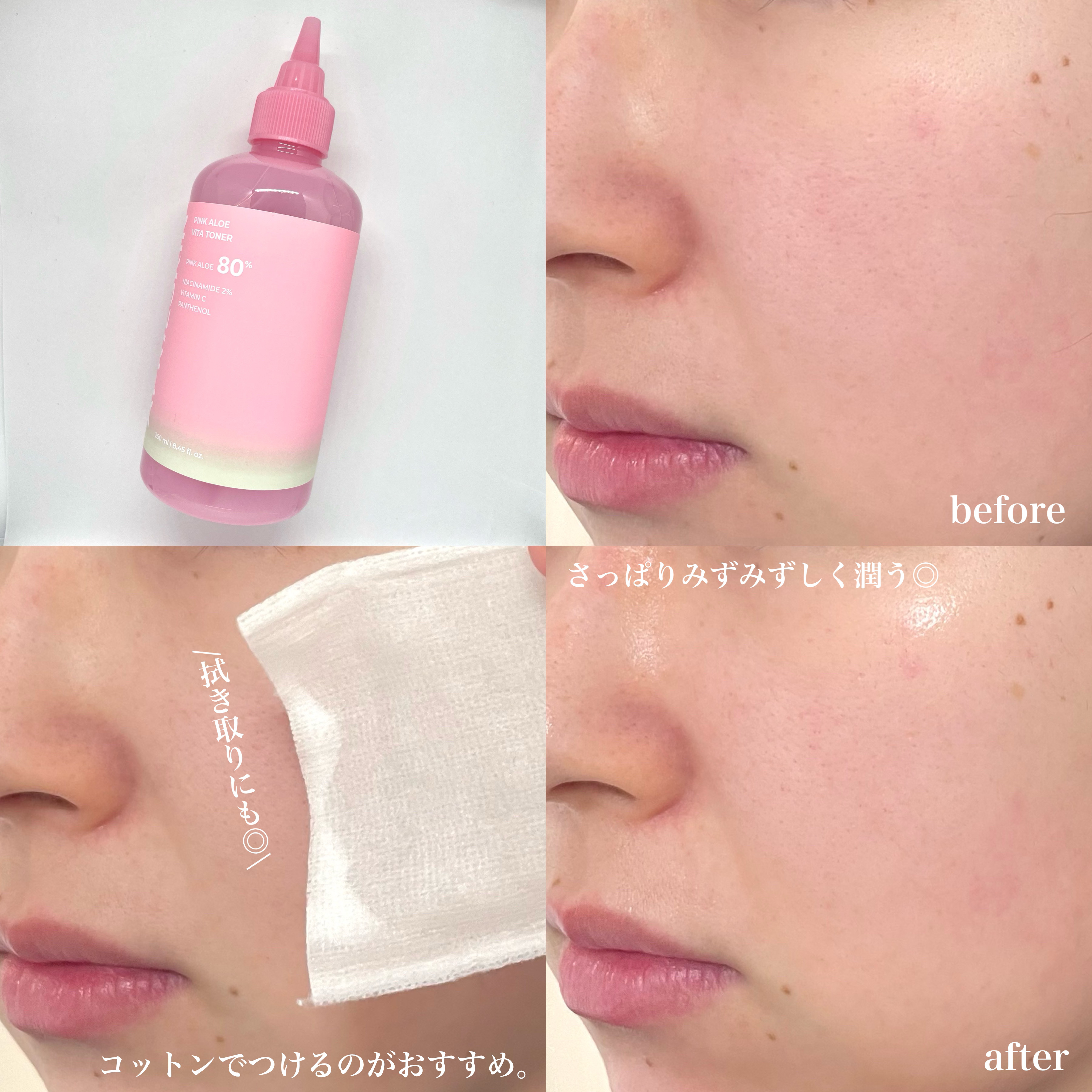 人気のピンクアロエシリーズから出ている化粧水︎💕︎︎ 鎮静効果がより高いピンクアロエが80%も配合されてるんだって! 飾ってても可愛いボトルだし、トンガリ部分が思ったより使いやすくてさらに好き😂!