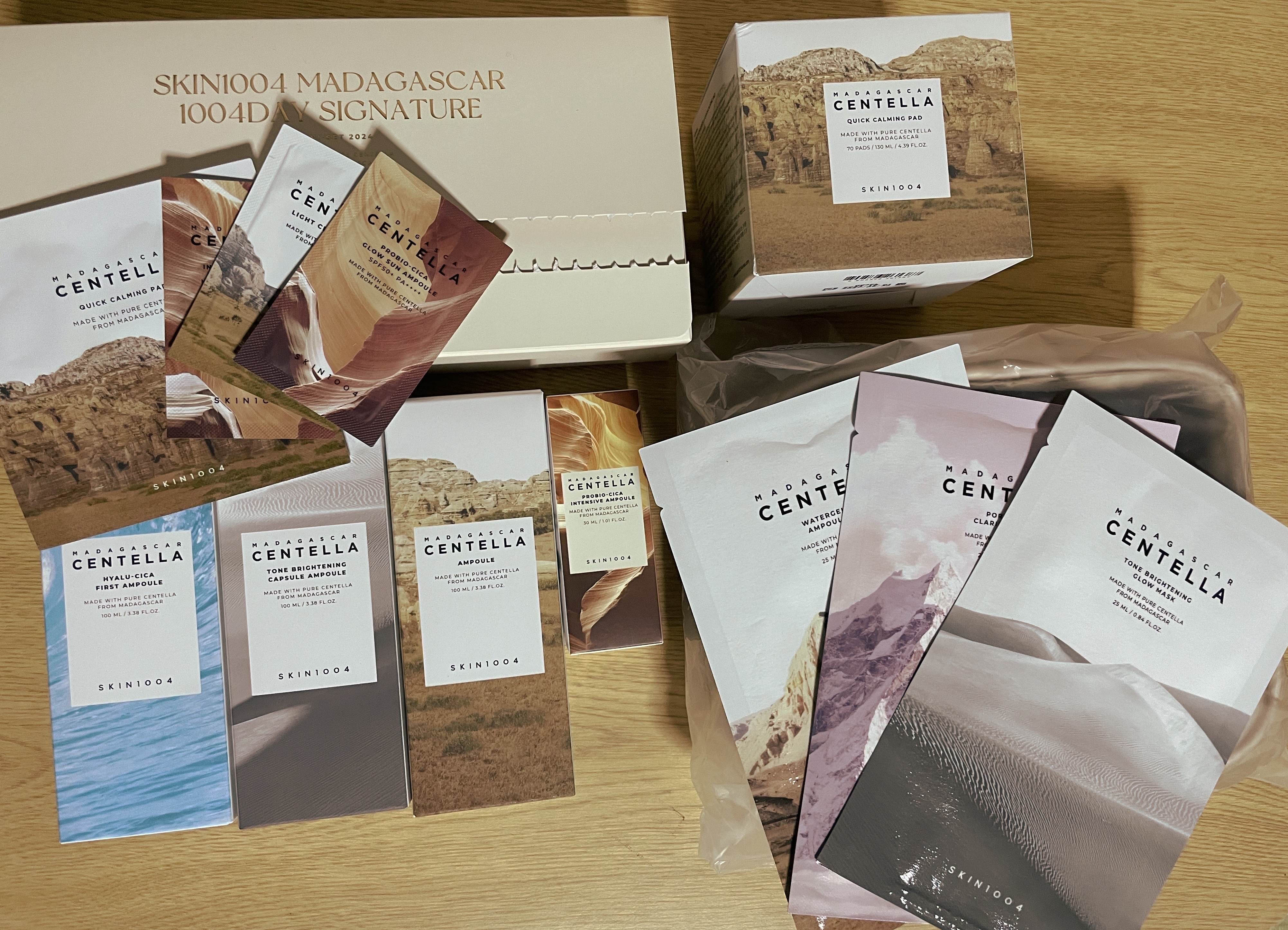 1番人気のアンプルとトナーパッドにランダムで商品付いてくる感じ!私の場合はクーポン使って17,000円相当→7,000円🥺 おまけの大きめポーチとパックも豪華で嬉しい♡ SKIN1004のQoo10公式ショップで買いました!