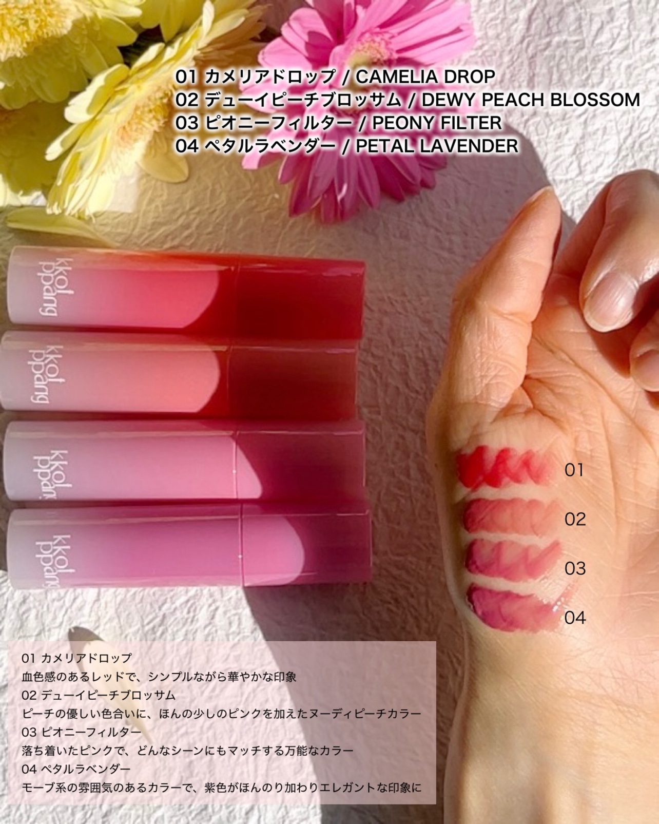 日本未進出のブランド、KKOTPPANG(コッパン)のリップ3種をお試しさせて頂きました💖 ブランドのスローガン「꽃이 빵피네!」は「花がパーンと咲く」という意味で、若い世代に向けて魅力的な製品を提供している、韓国のメイクアップブランド。 唇に輝く氷のような光沢を与える高保湿バームです。軽く塗るだけで、唇にしっかりと潤いを与えます。微細なパール粒子が配合されており、唇の上で輝くような美しい光沢感を演出します。 桜の香りが漂う高保湿なナイトケアリップバームです。乾燥して荒れた唇に優しくなじみ、潤いを長時間与えます。ふんわりと桜の匂いが癒される!!