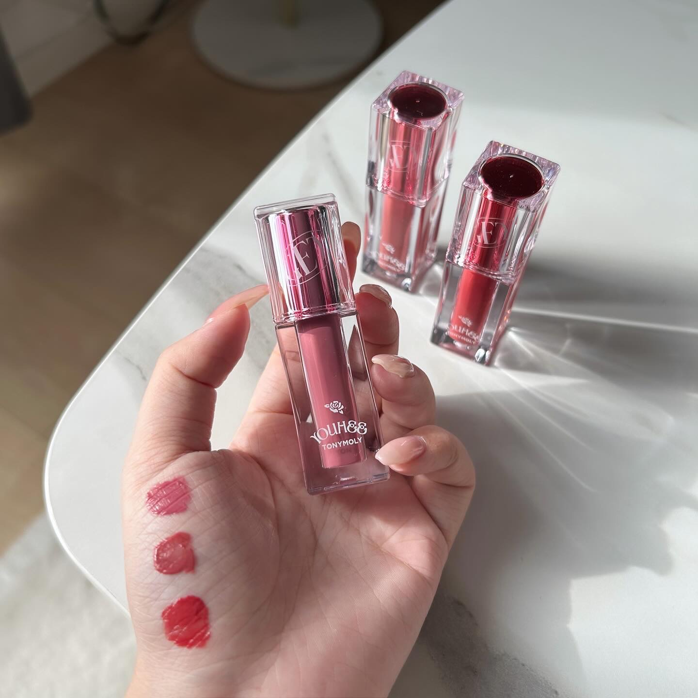 TONYMOLY (トニーモリー)の韓国のアパレルブランド YOUHEE (ユヒ)との数量限定コラボ商品! ⚫︎ 【YOUHEEコラボ】 グレーズバーム 透明バームで付けるとほんのり色づく♡ ガールコアームードたっぷりの限定色、限定デザインだよ🤭💓