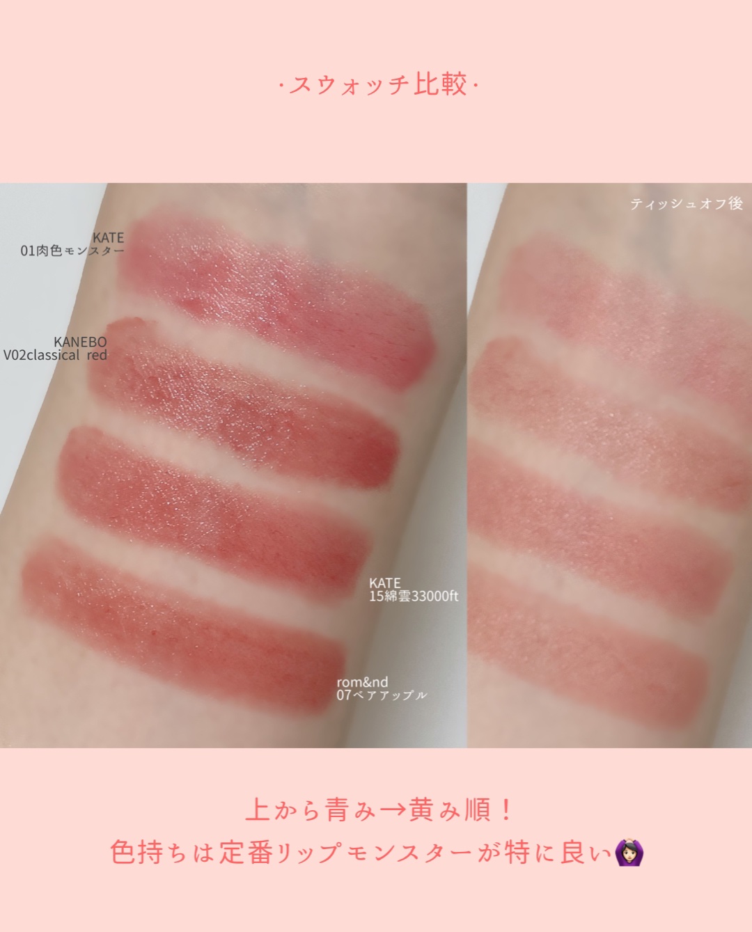 KATEリップモンスター15綿雲33000ft誰でも馴染みやすそうなレッドブラウンで、肌がパッと明るくなります✨派手すぎず地味すぎないカラーで、オフィスにもぴったり!03陽炎と比較するとかなりピンクみがあって、イエベ春・ブルベ夏の方におすすめ...