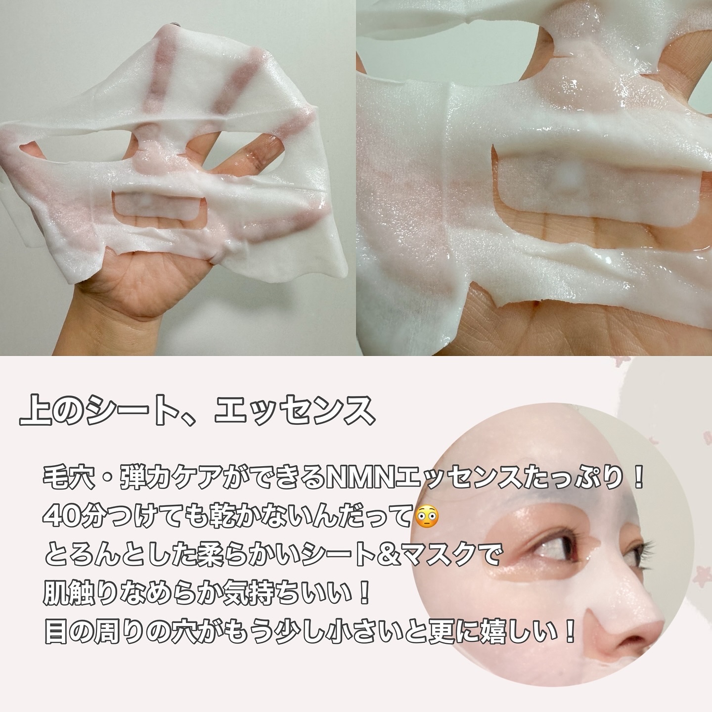 ナンバーズインがこだわり抜いた 今までにない上下でのシートパック+エッセンスまで異なるプレミアム立体密着マスクなの✨ 上用シートは毛穴、弾力ケアができるNMNエッセンスがたっぷりで40分付けていても乾かないの!!! 年齢によるたるみ毛穴も気になってたけど肌が引き締まって弾力ケアもできるの!