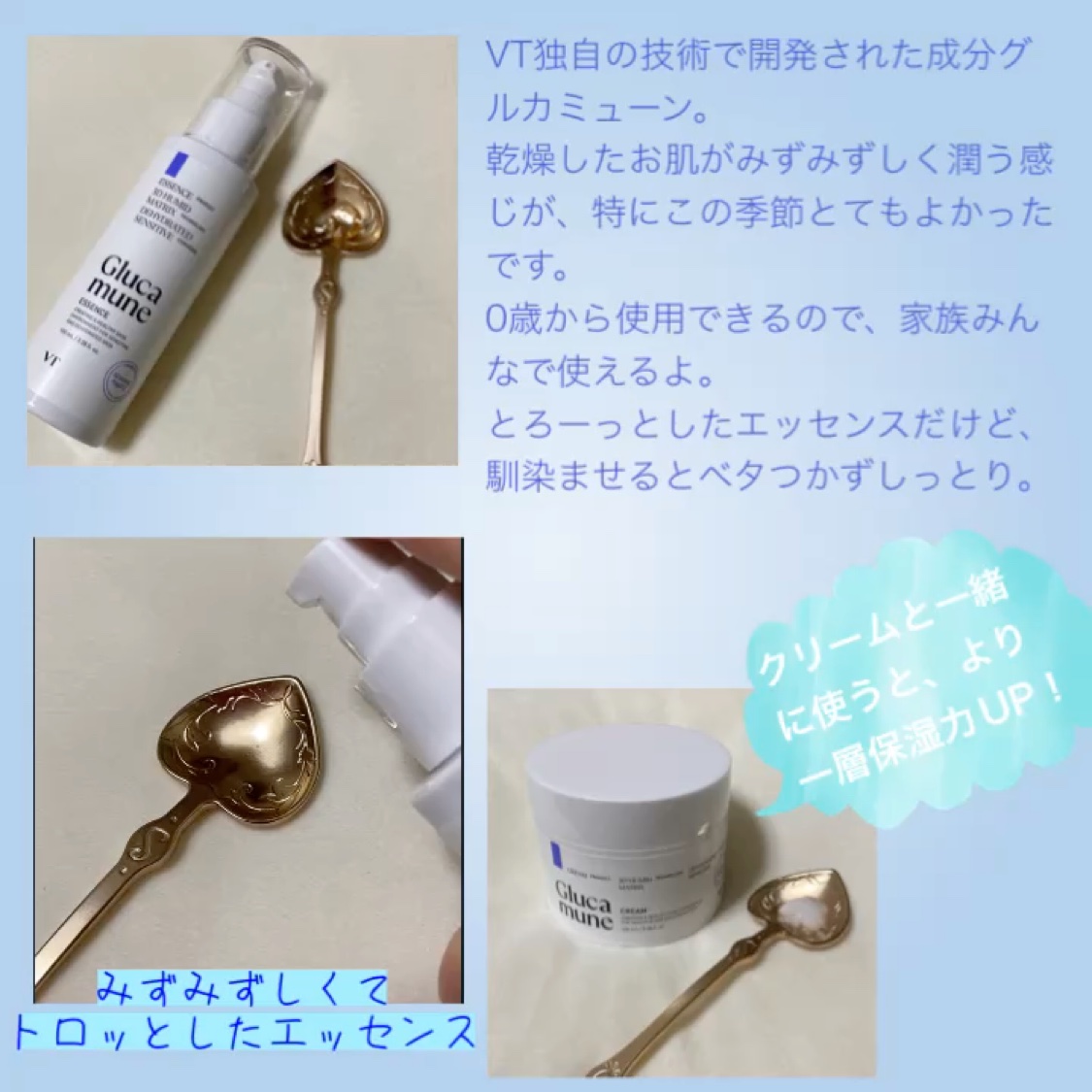 超敏感肌、超乾燥肌も使える水分爆誕セラム✨ グルカミューンは、かたつむりなどの粘液と自身の1000倍にあたる水分を引き付けてくるシロキクラゲに着目し、VT独自の技術で開発された成分なんだそう✨ ねっとり糸引くような粘り気のあるテクスチャーなのに、すーっと馴染んで水分量を上げてくれるような使い心地が新感覚すぎる✨ しかも、シロキクラゲ由来の植物性成分なので、0歳の新生児から使えるのにもびっくり…!