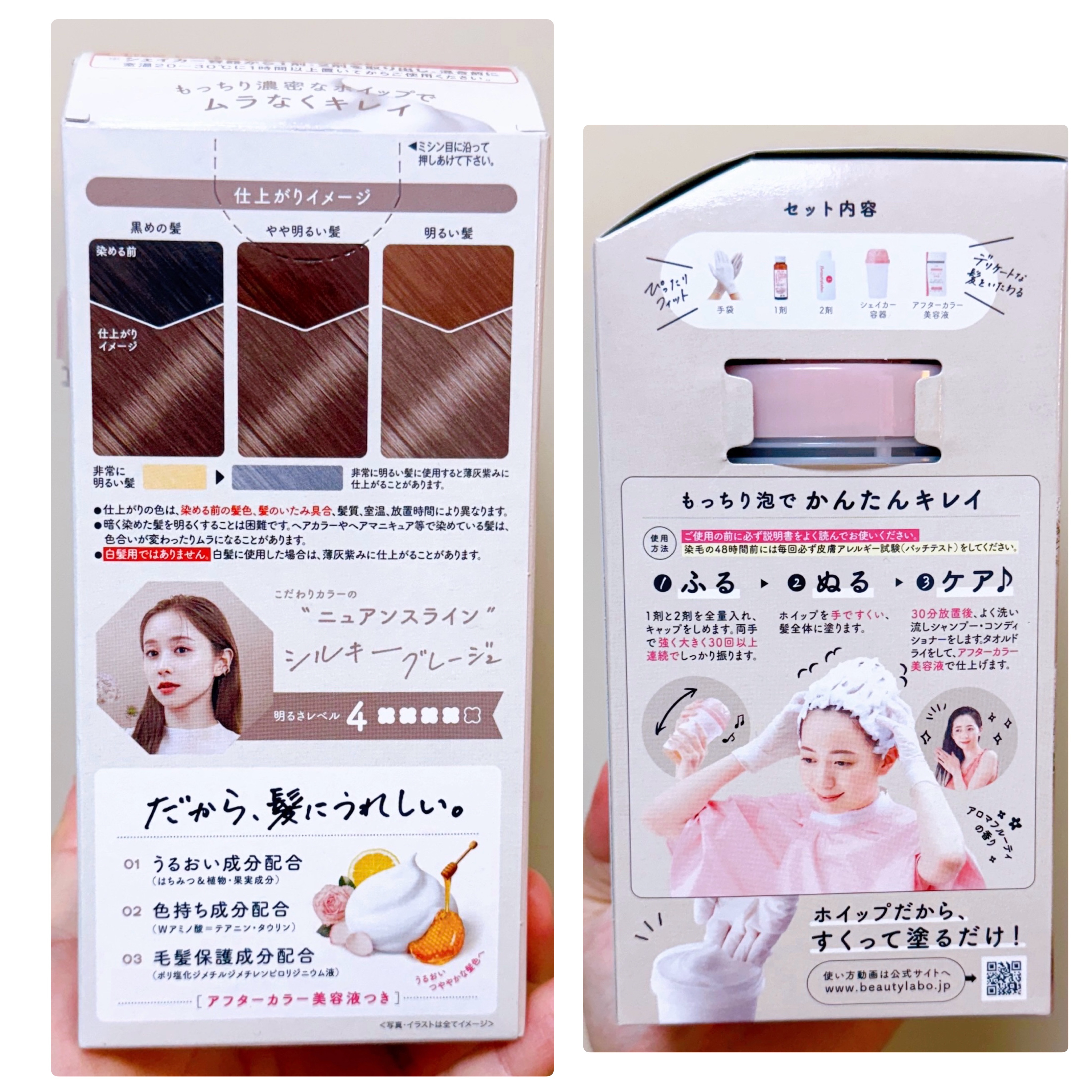 - <医薬部外品> ●髪にうれしい3つの成分が「うるおい つややかな髪色」に導きます うるおい成分(はちみつ&植物・果実成分) 色持ち成分(W アミノ酸=テアニン・タウリン) 毛髪保護成分(ポリ塩化ジメチルジメチレンピロリジニウム液) ● 使い方カンタン。シェイカー容器で一度にホイップを作れるから、あとはすくって塗るだけ ●もっちり濃密なホイップで、ムラになりにくくキレイに染まる ● 全18色のカラーバリエーション 「ナチュラルライン」と「ニュアンスライン」、2つのカラーラインナップから選べます ● アフターカラー美容液つき パッケージ内容:1剤、5剤、シェイカー容器、手袋、使用説明書、アフターカラー美容液