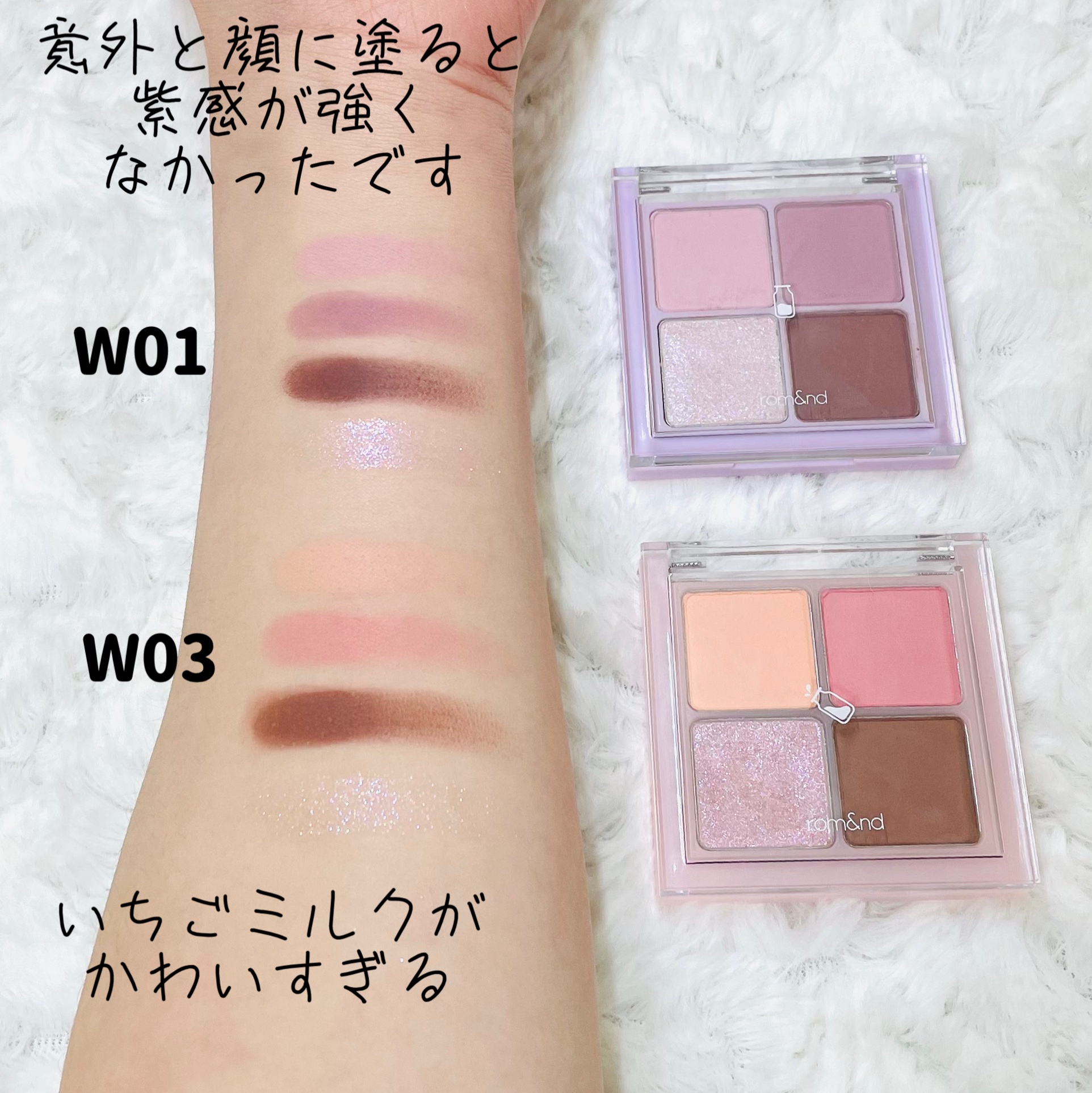 rom&ndベターザンアイズミルクシリーズW03ドライストロベリーですいちごみるく🍓のような配色のアイシャドウ🍓🤍ふんわり発色で可愛らしいアイメイクができちゃいます🎀私は上段の2色を混ぜて、アイホール全体にふんわり乗せたあと、左下のラメをまぶ...