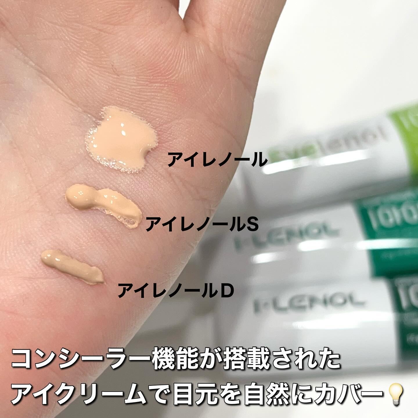 - <アイレノール クマクリーム> 水、シクロペンタシロキサン、グリセリン、ナイアシンアミド、ツボクサ葉エキス、サンゴエキス、パンテノール、イソヘキサデカン、ヒドロキシエチルウレア、ジメチコノール、アラントイン、グリチルリチン酸2K、プロパンジオール、カプリルヒドロキサム酸、香料、オリーブ果実油、酢酸トコフェロール、ホホバ種子油、オレイン酸ソルビタン、アルガニアスピノサ核油、アデノシン、エチルヘキシルグリセリン、プルラン、ヒアルロン酸Na、EDTA-2Na、トリデセス-6、DNA-Na、(アクリル酸グリセリル/アクリル酸)コポリマー、リノール酸グリセリル、ペンチレングリコール、リノレン酸グリセリル、アラキドン酸グリセリル、パルミチン酸レチノール、ラウリン酸K、ピーナッツ油、ヒアルロン酸クロスポリマーNa、トマト果実エキス、ブロッコリーエキス、ケール葉エキス、キャベツ葉エキス、チャ葉エキス、レモン果実エキス、アスパラガスエキス、フラガリアチロエンシス果実エキス、カキ葉エキス、トウガラシ果実エキス、水溶性プロテオグリカン、アスタキサンチン、ヒアルロン酸、トコフェロール、パルミチン酸アスコルビル、酸化チタン、酸化鉄、他 <アイレノール クマクリームS> 水、シクロペンタシロキサン、グリセリン、ナイアシンアミド、ツボクサ葉エキス、サンゴエキス、パンテノール、イソヘキサデカン、ヒドロキシエチルウレア、ジメチコノール、アラントイン、グリチルリチン酸2K、プロパンジオール、カプリルヒドロキサム酸、香料、オリーブ果実油、酢酸トコフェロール、ホホバ種子油、オレイン酸ソルビタン、アルガニアスピノサ核油、アデノシン、エチルヘキシルグリセリン、プルラン、ヒアルロン酸Na、EDTA-2Na、トリデセス-6、DNA-Na、(アクリル酸グリセリル/アクリル酸)コポリマー、リノール酸グリセリル、ペンチレングリコール、リノレン酸グリセリル、アラキドン酸グリセリル、パルミチン酸レチノール、ラウリン酸K、ピーナッツ油、ヒアルロン酸クロスポリマーNa、トマト果実エキス、ブロッコリーエキス、ケール葉エキス、キャベツ葉エキス、チャ葉エキス、レモン果実エキス、アスパラガスエキス、フラガリアチロエンシス果実エキス、カキ葉エキス、トウガラシ果実エキス、水溶性プロテオグリカン、アスタキサンチン、ヒアルロン酸、トコフェロール、パルミチン酸アスコルビル、酸化チタン、酸化鉄、他