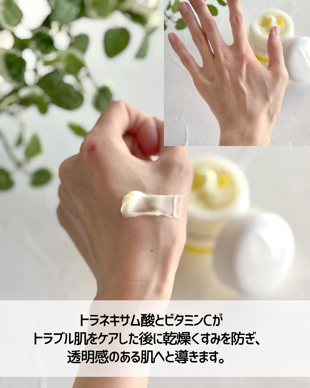 鎮静ケアとニキビ跡などの色素沈着によるトラブル跡までケアできる機能性クリーム✨ 別名【消しゴムクリーム】 ✅トラネキサム酸でシミやくすみ、色素沈着の改善やメラニン色素の生成を抑制 ぷるんとした水分感のあるクリームなのにこっくりとした感じもあり、濃密な保湿感◎