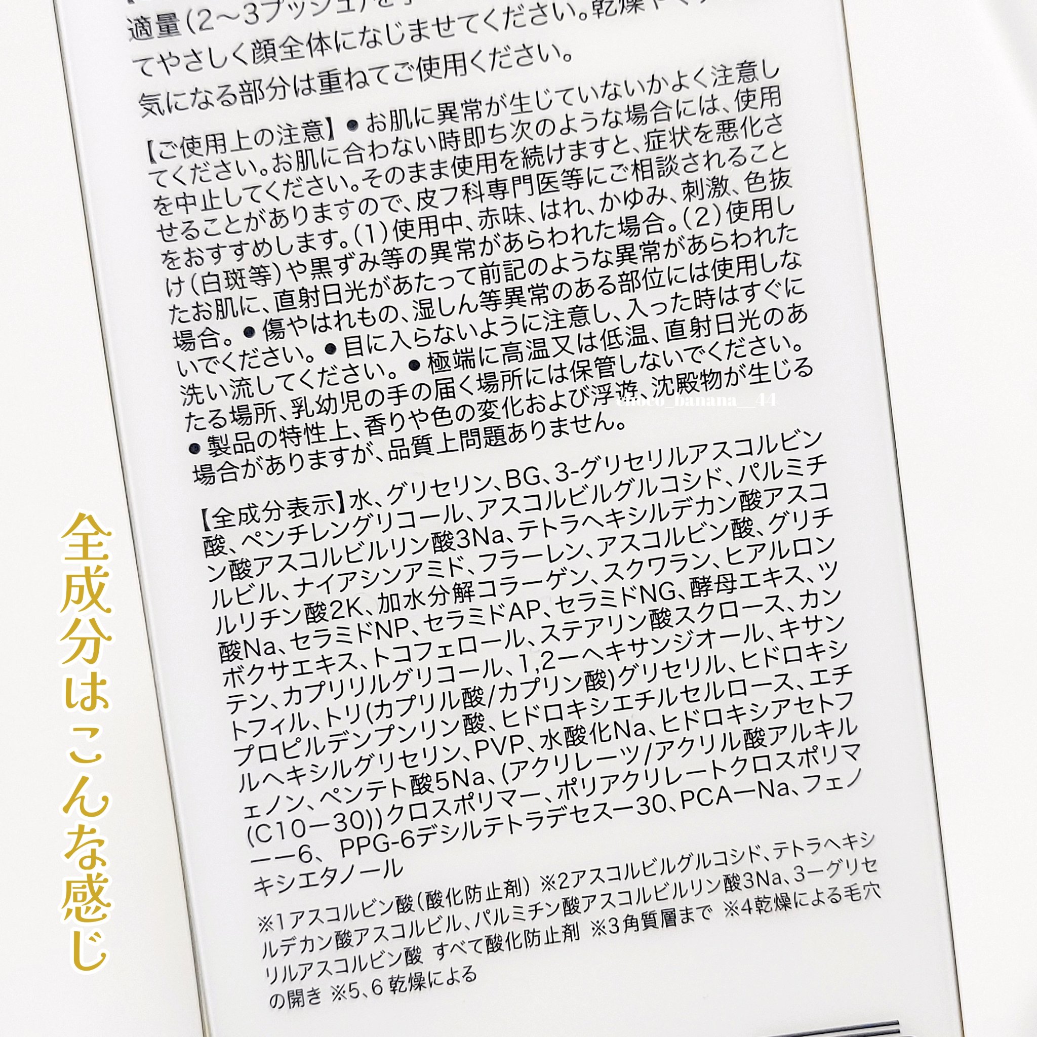 - <30ml> 水、グリセリン、BG、3-グリセリルアスコルビン酸、ペンチレングリコール、アスコルビルグルコシド、パルミチン酸アスコルビルリン酸3Na、テトラヘキシルデカン酸アスコルビル、ナイアシンアミド、フラーレン、アスコルビン酸、グリチルリチン酸2K、加水分解コラーゲン、スクワラン、ヒアルロン酸Na、セラミドNP、セラミドAP、セラミドNG、酵母エキス、ツボクサエキス、トコフェロール、ステアリン酸スクロース、カンテン、カプリリルグリコール、1,2-ヘキサンジオール、キサントフィル、トリ(カプリル酸/カプリン酸)グリセリル、ヒドロキシプロピルデンプンリン酸、ヒドロキシエチルセルロース、エチルヘキシルグリセリン、PVP、水酸化Na、ヒドロキシアセトフェノン、ペンテト酸5Na、(アクリレーツ/アクリル酸アルキル(C10-30))クロスポリマー、ポリアクリレートクロスポリマー-6、PPG-6デシルテトラデセス-30、PCA-Na、フェノキシエタノール