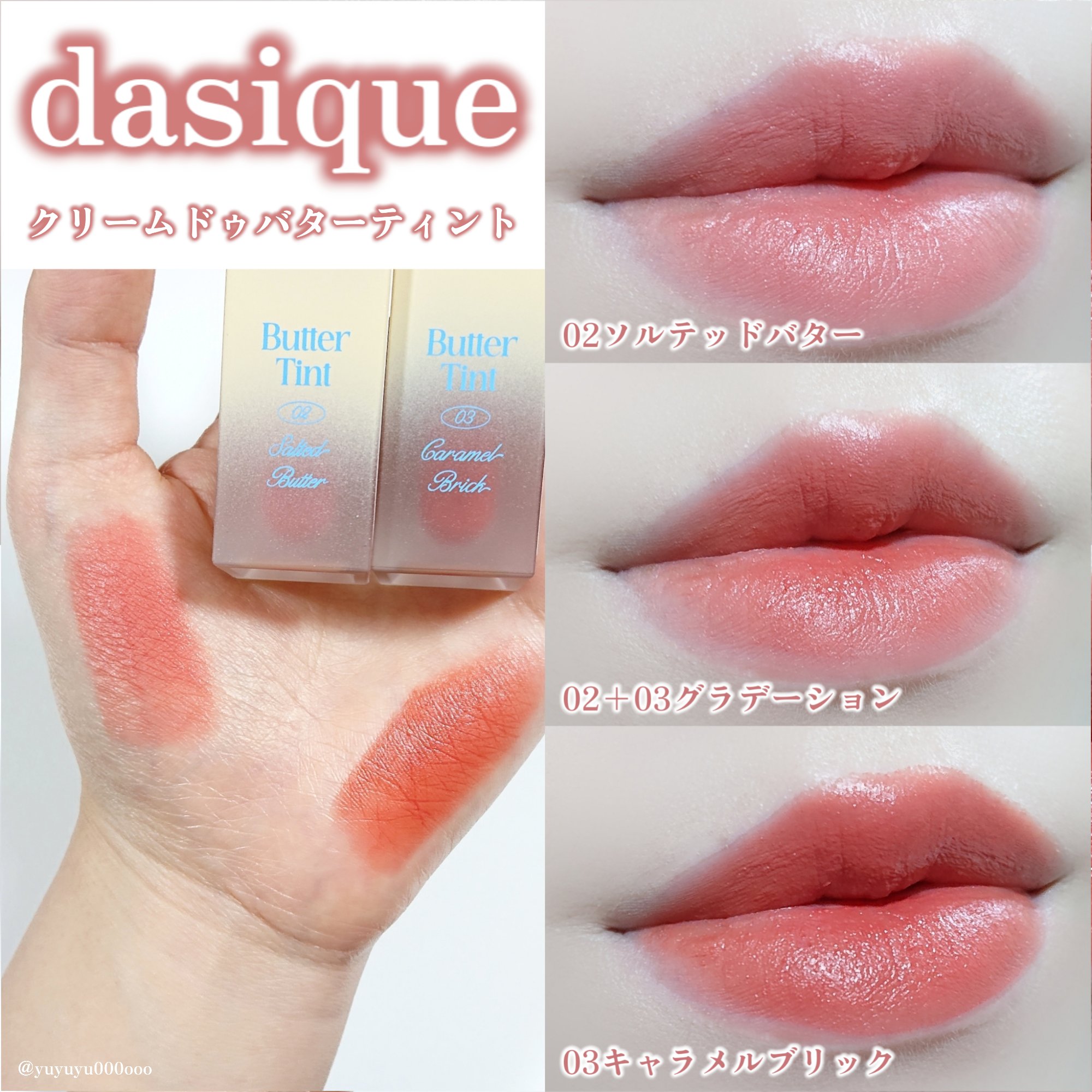 バターティント全4色スウォッチ🧈❤︎.* ︎︎ 【悲報】5/17〜5/19の限定SALEを今更投稿する まあ…かわいいから許してちょんまげ〜𐬦('ᢦ')𐬰 🔖.·dasique〈デイジーク〉クリームドゥバターティント¥1,760→→¥550...