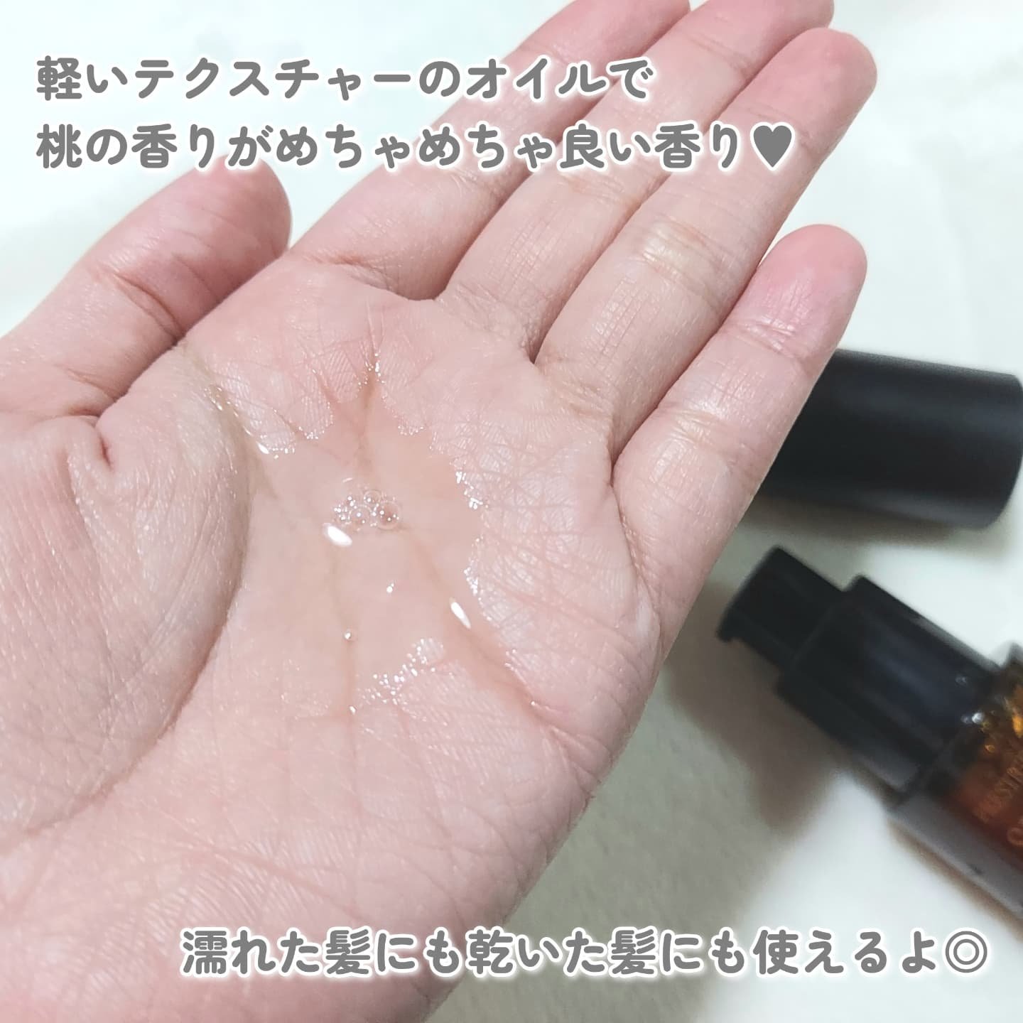 韓国のヘアケアサロン専売品発 CULRY SHYLL(カーリーシール)のSILKY OIL SERUM ダメージヘアケアに使用してます ピーチの香りでパフューム代わりにも使える◎ サラサラした軽いオイルで髪の毛ペタつかず良かった◎
