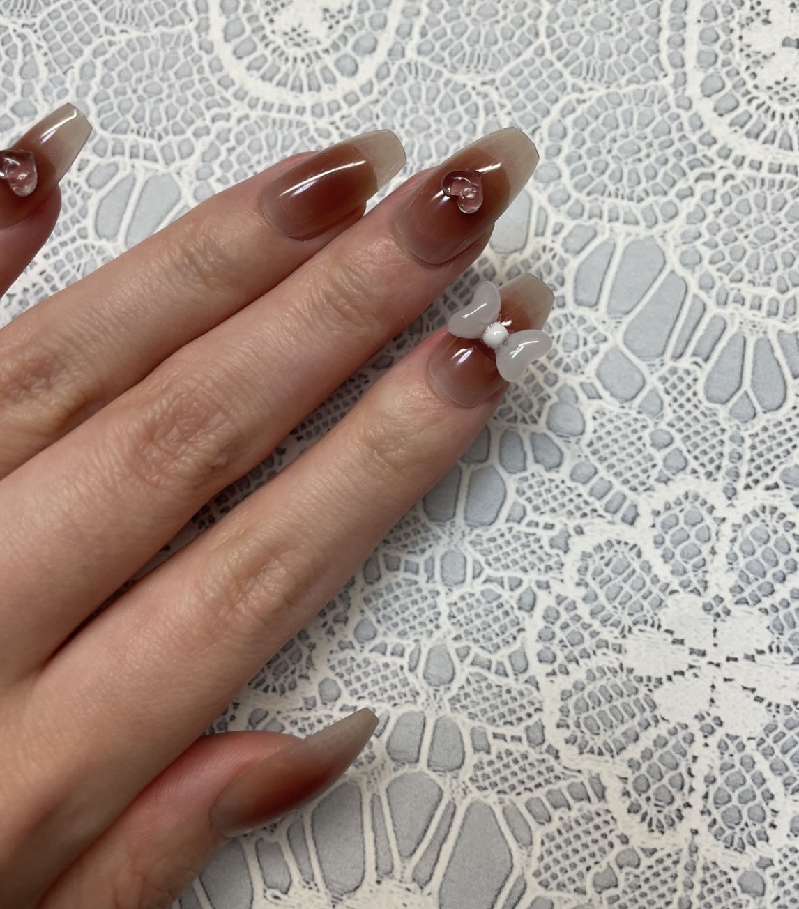ワンホンちゃん風の大人デザインがお気に入りで何回もリピしてる🖤ネイルチップ❕ちょい長めだが、やっぱり長い方が手が綺麗に見える気がする🤔リボンのシール貼ってトップコート塗ってます❕SHEINで買いました❣️😙🛒💨#セルフネイル#ネイルチップ#ネ...