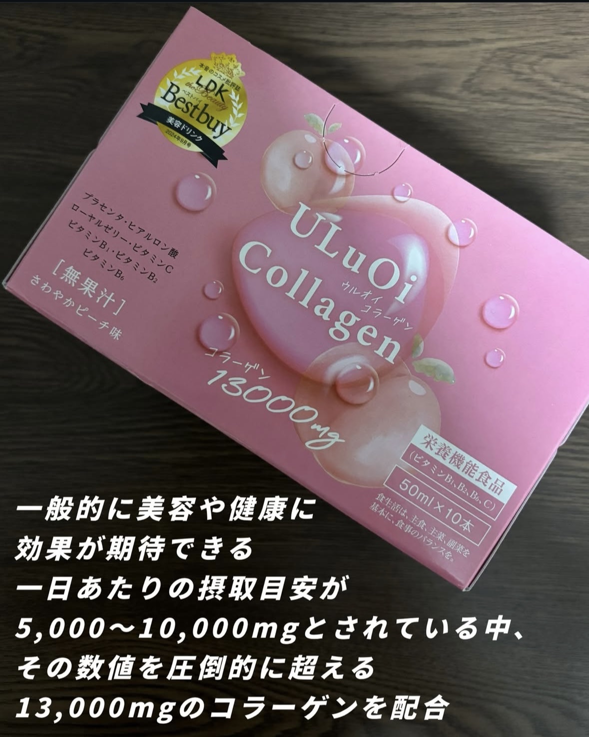 LDK the Beauty COSME OF THE YEAR受賞!! 【ULuOi Collagen(うるおいコラーゲン)13000】 キレイになりたい女の子のためのコラーゲンドリンク❣️❣️❣️ コラーゲン13,000mg!!! 7種の美サポート成分配合!!(プラセンタ・ヒアルロン酸・ロイヤルゼリー・ビタミンC・ビタミンB₁・ビタミンB₂・ビタミンB₆) 美味しさにもこだわりを感じるさわやかなピーチ味🍑 飲みやすい🍑