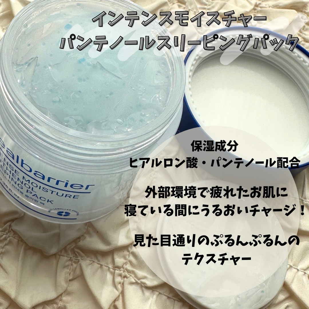 たっぷりの潤いでもっちり肌に仕上がります💓 とろみのあるテクスチャーだけど、ベタつきや重さがなくて使いやすいです✨ 体温で溶けていくような使用感で、なめらかに塗れます👍🏻 ベタつきのない保湿感でとっても好き🥰 寝ながら水分チャージして、肌を守ってくれるスリーピングパックです✨ 水分感たっぷりのみずみずしいジェルテクスチャーで、うるっうるな膜を張ったような使い心地です🫧