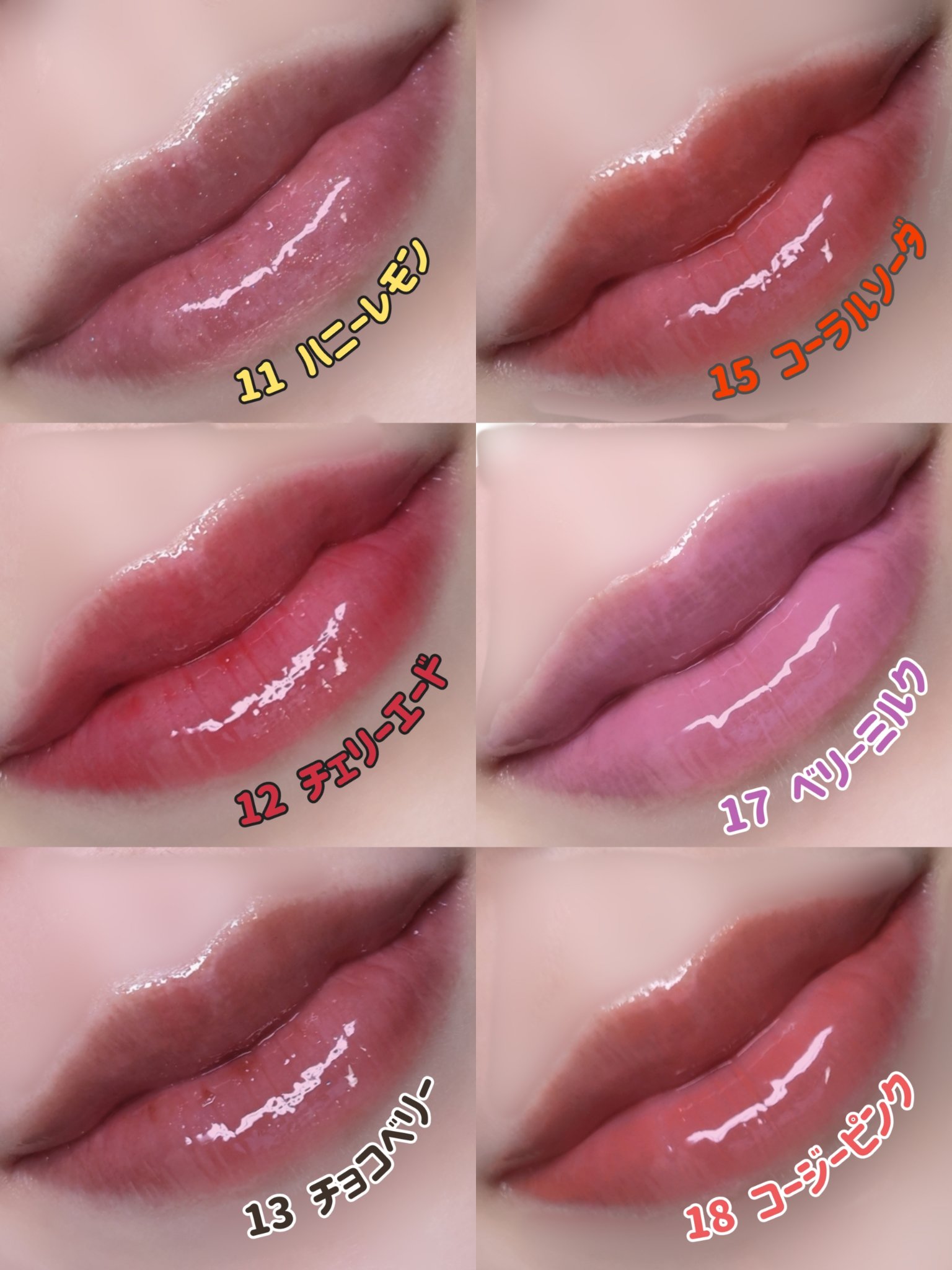 唇のしわをカバーしてくれるボリューム感リップオイルだよ💞 特に11番はプランピング効果でぷっくり唇にしてくれるよ💋 プランパー使うとぷっくり唇になる気がしてお気に入り♡ハニーレモンのラメがかわいい!♡