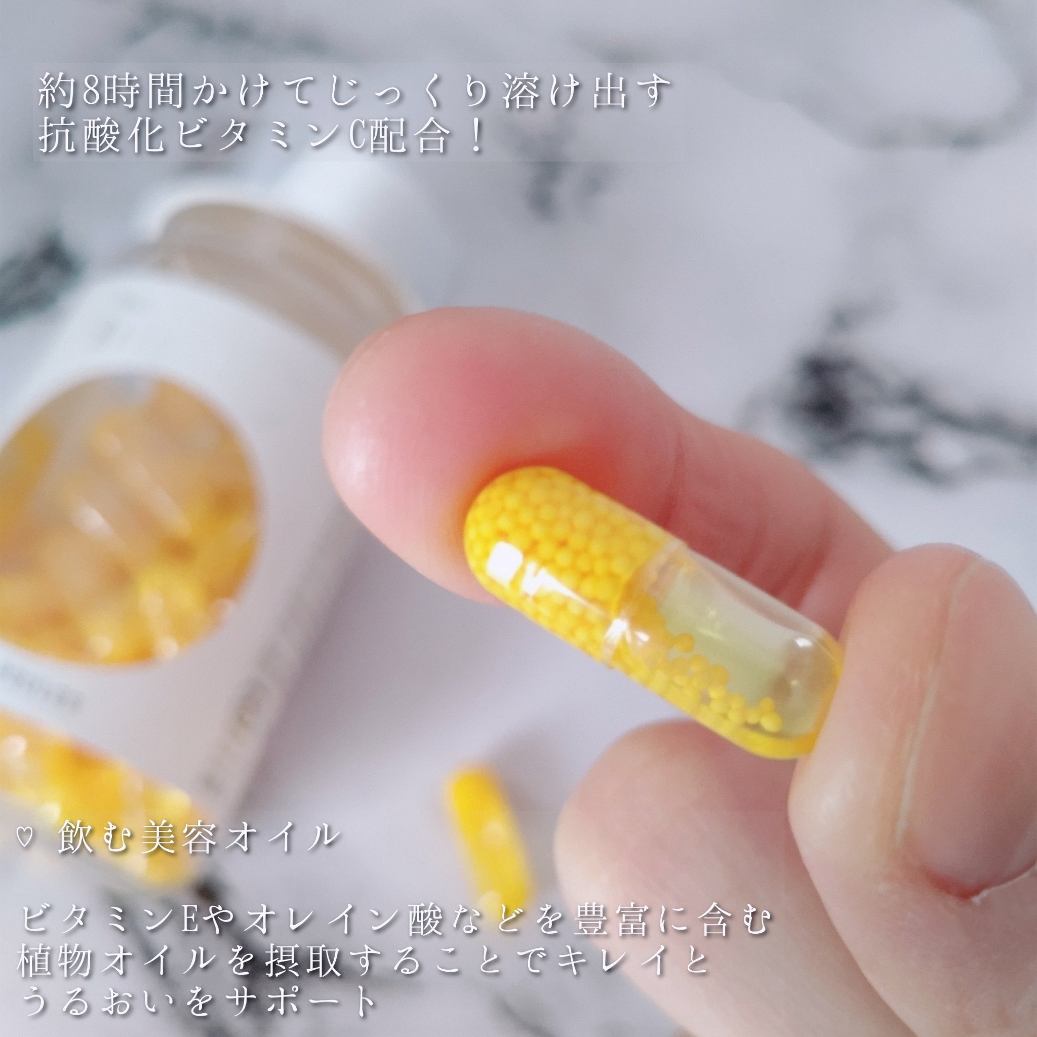 見た目も可愛い、ビタミンCカプセル💊 時間をかけてじっくり溶ける多重構造のビタミンCビーズをぎゅっと詰め込んだカプセルです! 美容成分がたっぷり♡うるおいサポート✨ アルガンオイル・カメリアオイル アボカドオイル・オリーブオイルに抗酸化ビタミンE・ビタミンAも同時に摂れるよ! 毎日手軽に飲む透明感習慣! 飲みやすいサイズでおすすめです♪