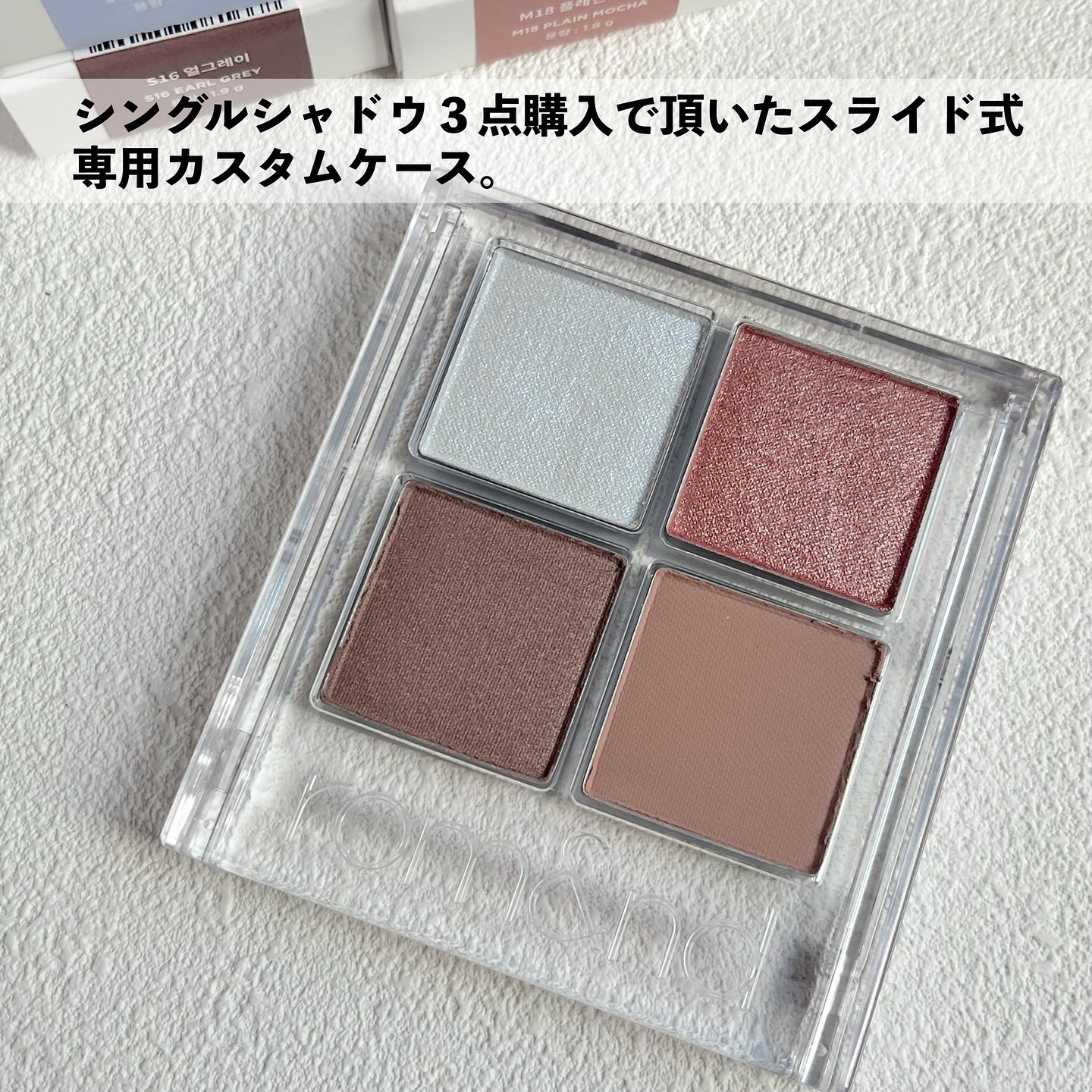 自分の好みだけ選んでセット:・゚✧* rom&ndのシングルシャドウ #スライドインシングル 手持ちのアイシャドウと組み合わせやすそうで普段使いしやすそうな4色を選んだよ メガポ対象品になってるみたいでクーポン使うともっとお安く買えるから今が買い時かも??