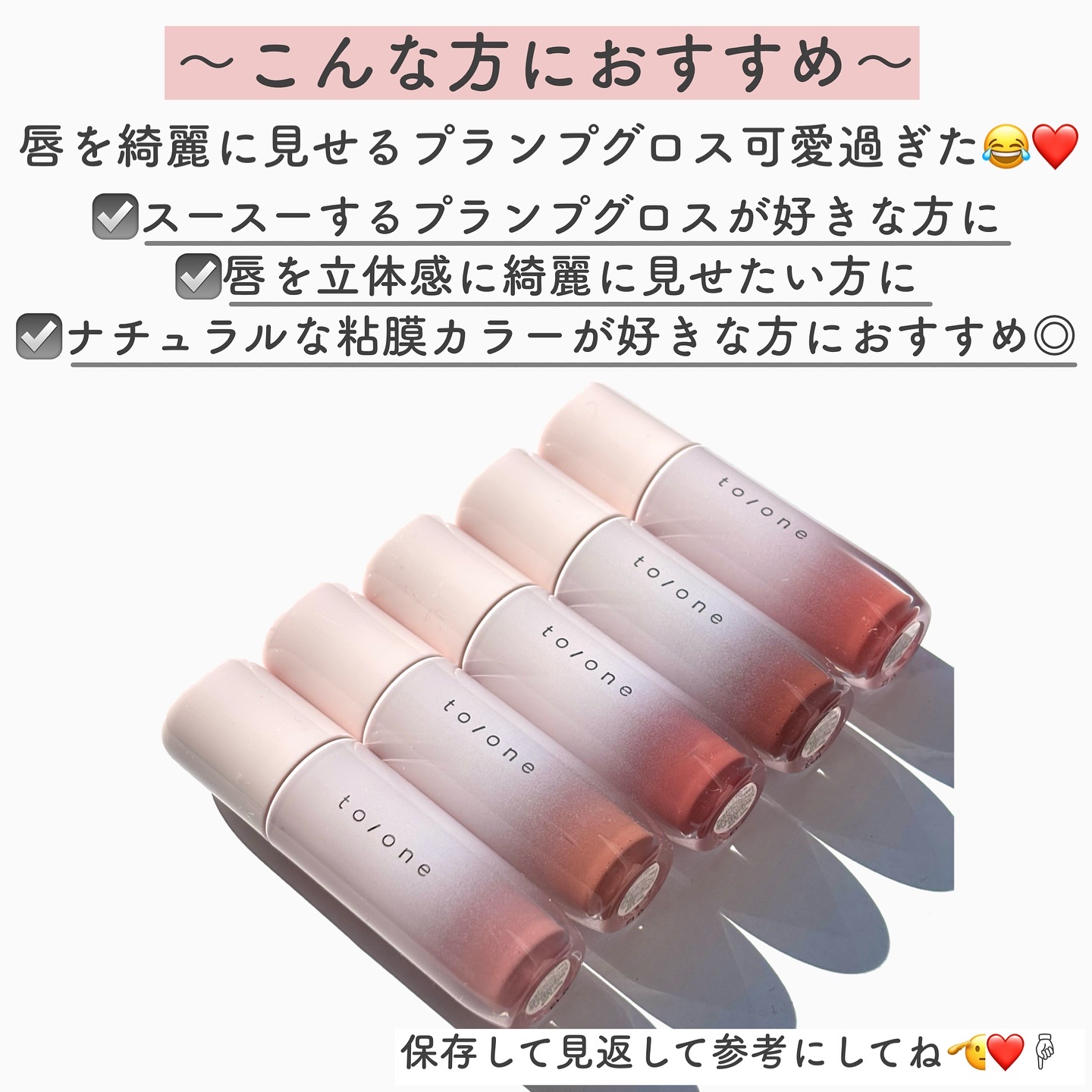 天然プランプ成分*配合のto/oneの新作リップは要チェック✨️ まるでリップケア?ってくらいしっとり。ぷるんとしたツヤとボリューム感で自信が持てて既にお守りみたいな存在😌 お気に入りは01。くすんだ唇もピュアな印象に。さりげなくパールがキラリ💎