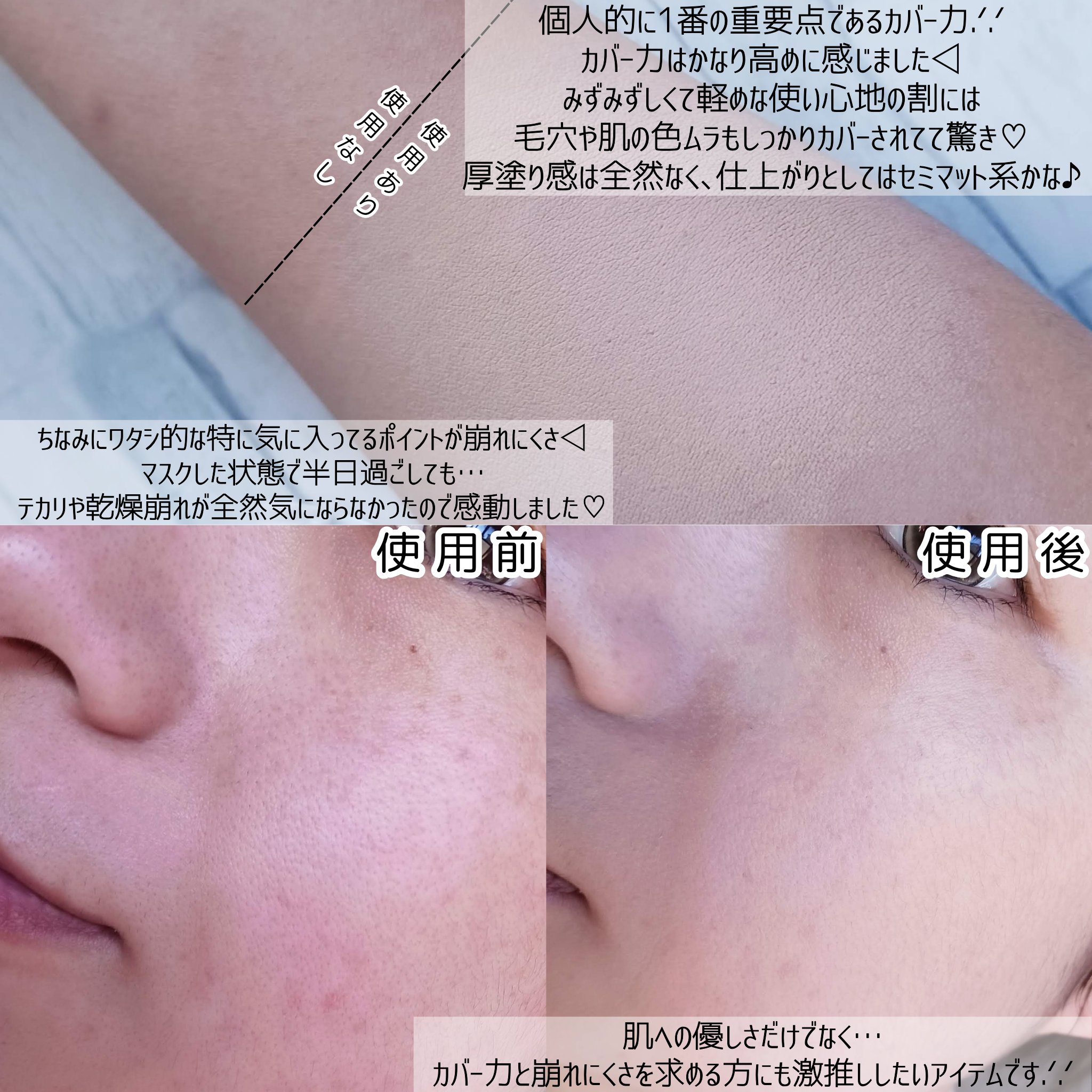 薄くムラなく肌に密着◁ キレイな仕上がりが長く続く♪ 軽い使い心地ではあるもののカバー力はかなり高め◁ 毛穴から肌の色ムラまでしっかりとカバーする事ができたので感動♡ 自然なマット感を求める方や…しっかりとしたカバー力が欲しいけど厚塗り感はNGって方に特に激推ししたいアイテムかも\(^o^)/