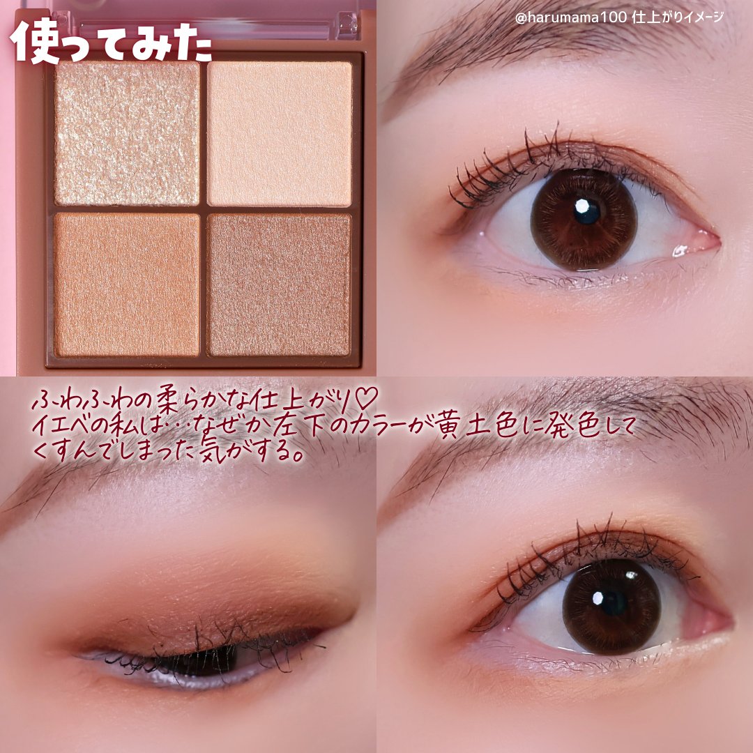 濃厚ブラウンで自然な陰影のある目元に仕上げるアイシャドウパレット🐻 透けマット×高輝度ラメの4色アイシャドウ👀💗 重ねてもくすみにくい透け感のあるマットカラーに、クリアな発色のラメをプラスして立体感と華やかさを演出✨ 優しげな目元になるまろやかなブラウンでデイリー使いしやすいカラーです