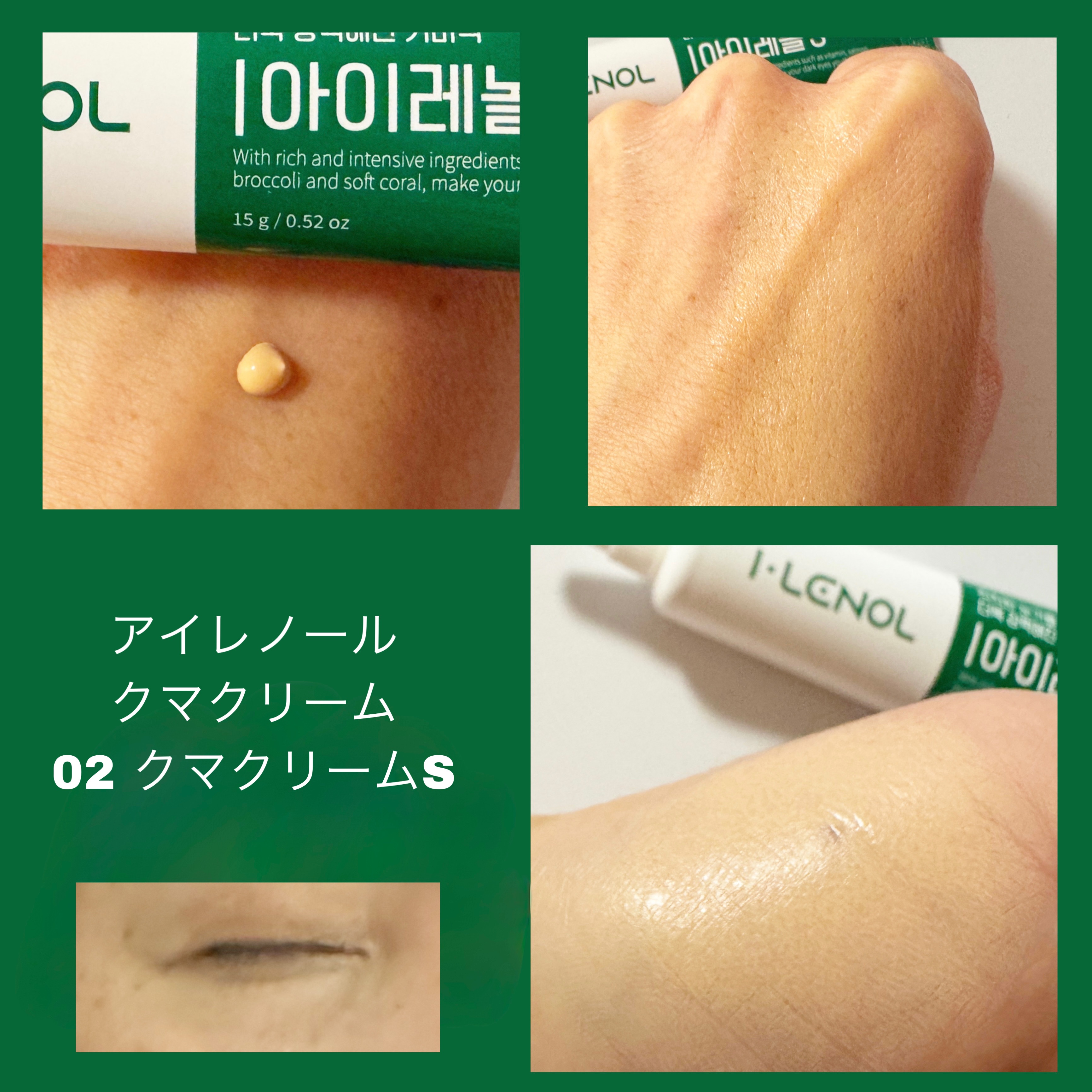 - <アイレノール クマクリーム> 水、シクロペンタシロキサン、グリセリン、ナイアシンアミド、ツボクサ葉エキス、サンゴエキス、パンテノール、イソヘキサデカン、ヒドロキシエチルウレア、ジメチコノール、アラントイン、グリチルリチン酸2K、プロパンジオール、カプリルヒドロキサム酸、香料、オリーブ果実油、酢酸トコフェロール、ホホバ種子油、オレイン酸ソルビタン、アルガニアスピノサ核油、アデノシン、エチルヘキシルグリセリン、プルラン、ヒアルロン酸Na、EDTA-2Na、トリデセス-6、DNA-Na、(アクリル酸グリセリル/アクリル酸)コポリマー、リノール酸グリセリル、ペンチレングリコール、リノレン酸グリセリル、アラキドン酸グリセリル、パルミチン酸レチノール、ラウリン酸K、ピーナッツ油、ヒアルロン酸クロスポリマーNa、トマト果実エキス、ブロッコリーエキス、ケール葉エキス、キャベツ葉エキス、チャ葉エキス、レモン果実エキス、アスパラガスエキス、フラガリアチロエンシス果実エキス、カキ葉エキス、トウガラシ果実エキス、水溶性プロテオグリカン、アスタキサンチン、ヒアルロン酸、トコフェロール、パルミチン酸アスコルビル、酸化チタン、酸化鉄、他 <アイレノール クマクリームS> 水、シクロペンタシロキサン、グリセリン、ナイアシンアミド、ツボクサ葉エキス、サンゴエキス、パンテノール、イソヘキサデカン、ヒドロキシエチルウレア、ジメチコノール、アラントイン、グリチルリチン酸2K、プロパンジオール、カプリルヒドロキサム酸、香料、オリーブ果実油、酢酸トコフェロール、ホホバ種子油、オレイン酸ソルビタン、アルガニアスピノサ核油、アデノシン、エチルヘキシルグリセリン、プルラン、ヒアルロン酸Na、EDTA-2Na、トリデセス-6、DNA-Na、(アクリル酸グリセリル/アクリル酸)コポリマー、リノール酸グリセリル、ペンチレングリコール、リノレン酸グリセリル、アラキドン酸グリセリル、パルミチン酸レチノール、ラウリン酸K、ピーナッツ油、ヒアルロン酸クロスポリマーNa、トマト果実エキス、ブロッコリーエキス、ケール葉エキス、キャベツ葉エキス、チャ葉エキス、レモン果実エキス、アスパラガスエキス、フラガリアチロエンシス果実エキス、カキ葉エキス、トウガラシ果実エキス、水溶性プロテオグリカン、アスタキサンチン、ヒアルロン酸、トコフェロール、パルミチン酸アスコルビル、酸化チタン、酸化鉄、他