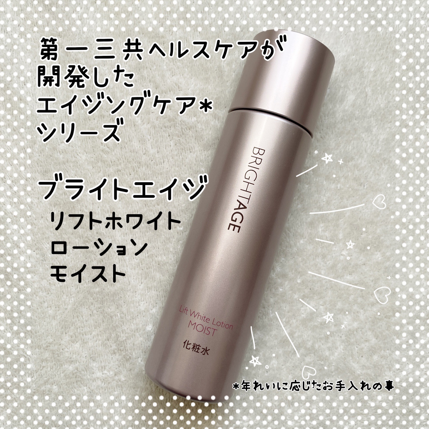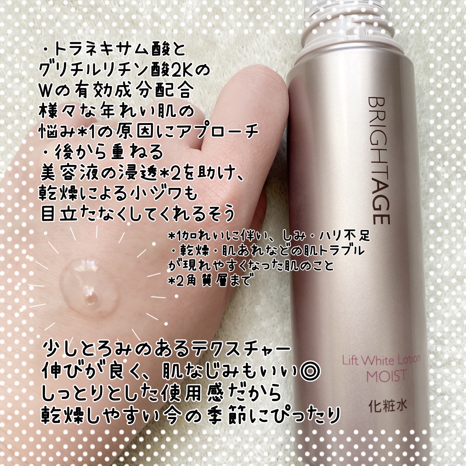 導入美容液と化粧水の機能を持つブライトエイジ とろみがあるテクスチャーで、まるで美容液のよう。だけど浸透力*についても非常にこだわっていて、さっとお肌に馴染みがよくて不思議なの✨ 高保湿設計だから特に今年のひどい乾燥対策にもめっちゃくちゃおすすめだよ🥰