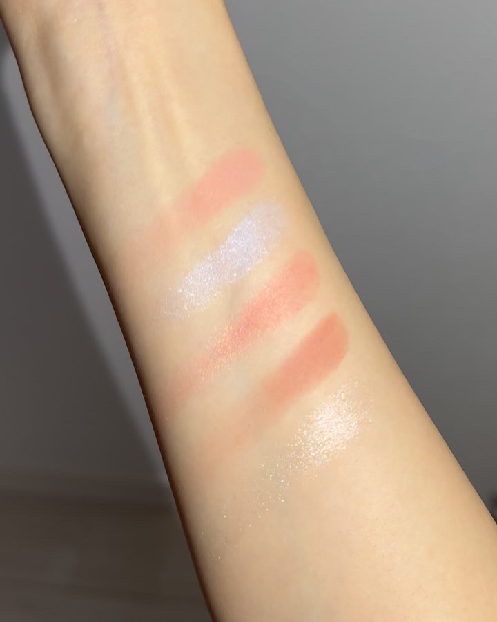 右上のピンクラメをベースに仕込んでメイクしたんだけどツヤと煌めき感えぐすぎる😳💎可愛い、、 そこに右下のカラーを重ねるとじんわり血色感が滲み出るような目元になるよ🦩 これは欠品店舗続出しそう🫣