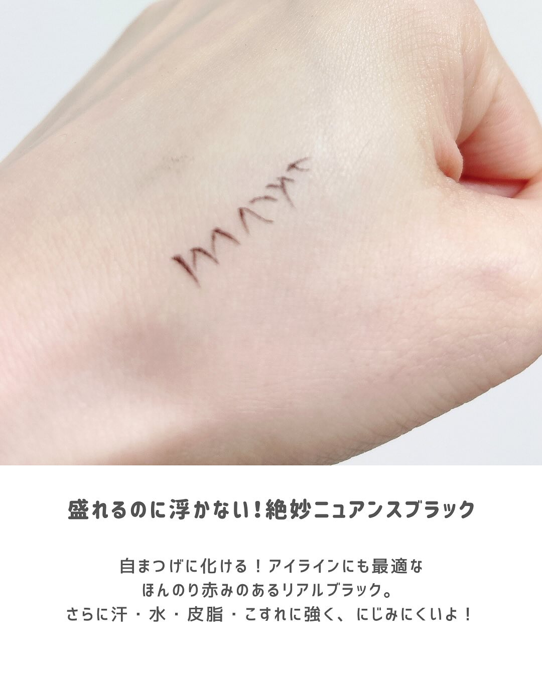 - 〈数量限定〉 極細ライン、植毛級の描き下まつげも狙い通り!下まつげ 爆盛れ極細ライナー! Point 1:筆先0.01mm、下まつげが綺麗に描ける超極細筆 まつげの根元埋めや目尻の極細ラインにも最適な極細タイプの筆を採用。無い下まつげは描いて盛る!まるで植毛のように、足りないまつげを自然に描けます。極細だからキワも目尻もキレイに描け、憧れの涙ぼくろもリアル&簡単に描けます。 Point 2:盛れるのに浮かない!絶妙ニュアンスブラック ! 自まつげに化ける!アイラインにも最適なほんのり赤みのあるリアルブラック。 Point 3:汗・水・皮脂・こすれに強く、にじみにくいウォータープルーフ 美容液成分※ 配合 ※カミツレ花エキス、チャ葉エキス (すべてうるおい成分) お湯で簡単にメイクOFF MADE IN JAPAN <ご使用時にお読みください> ・ご使用の際は、毎回キャップをしめたまま、よく振ってからお使いください。色が薄くなって描きづらくなった場合は、キャップをしめたままよく振って下向きで数分放置し、ティッシュ等でペン先をなじませてから、お使いください。 ・筆先を横に向けた状態で保管してください。 2025年1月22日(水)先行発売 @cosme STORE/@cosme TOKYO/@cosme OSAKA ※取り扱い状況は店舗により異なります 2025年2月10日(月)全国発売