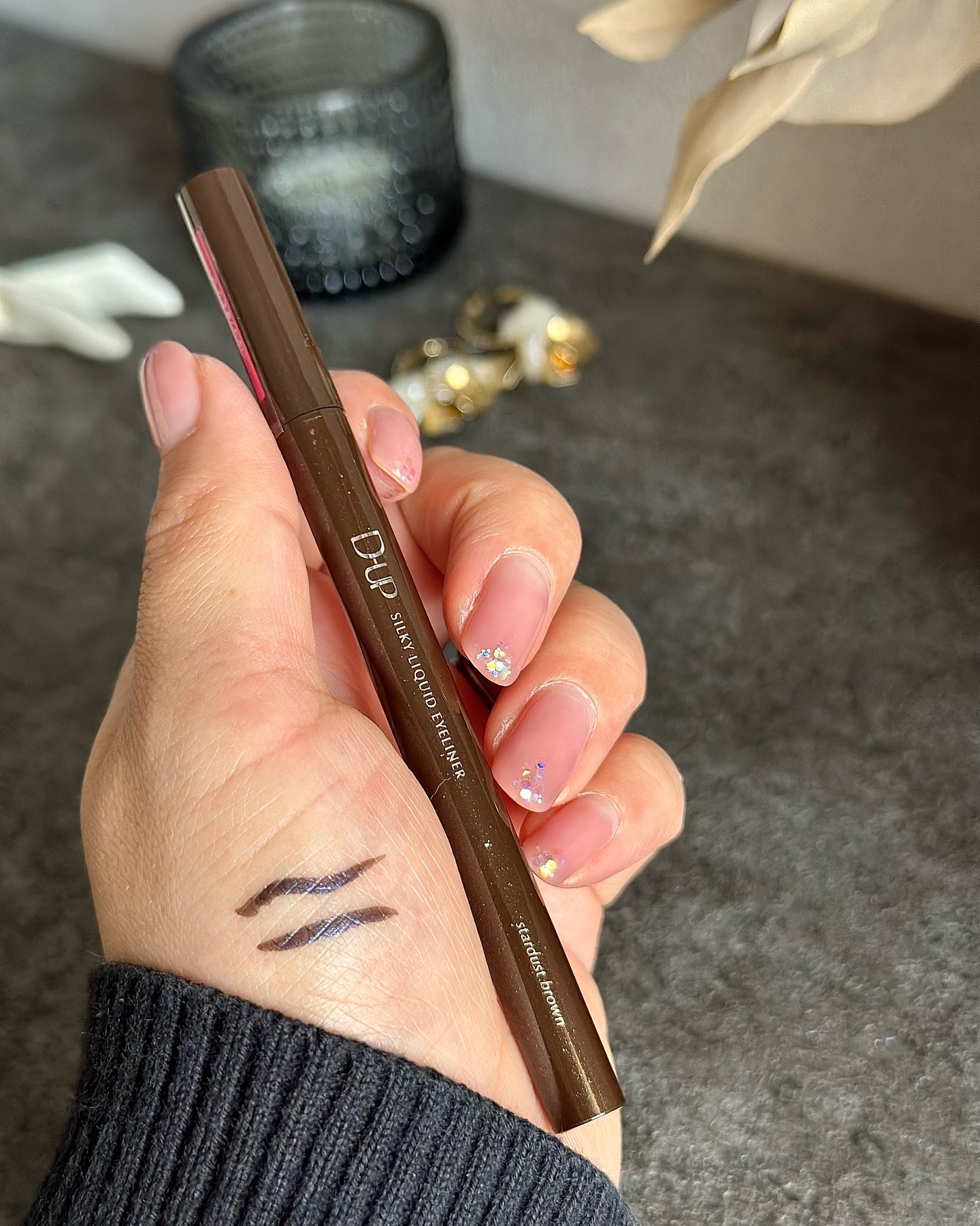 みんな大好き💞ベスコス多数受賞のD-UPから初のラメ入り「スターダストブラウン」が登場! たっぷり贅沢に閉じ込められた繊細ラメが夜空の星屑のようにキラキラっと輝きます。 ラメの輝きで青みブラウンに見えるので白目もきれいに見えるし、冬メイクや夜のお出かけメイクにも良さそうです。