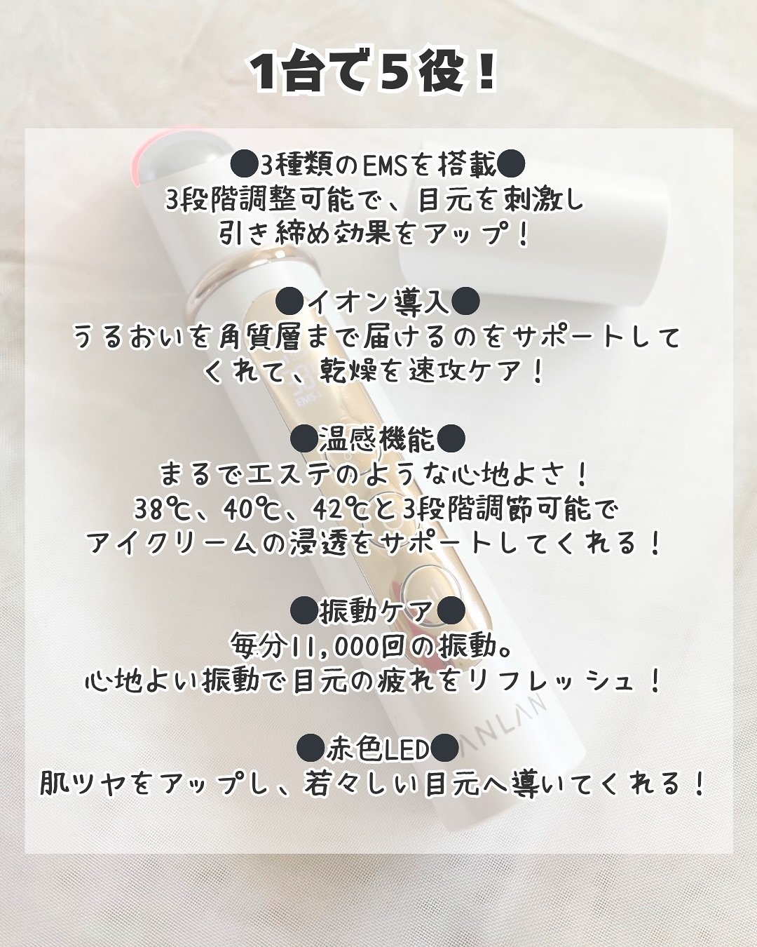 このスマートな見た目で5つの機能搭載 1日5分でOK 簡単に目元ケアができるよ✨ 温かさがちょうどよくてリラックスして顔の筋肉が柔らかくなる感じがする 美顔器で導入してOKな美容液でやってるんだけどもっちもちで手で塗るよりしっとり仕上がってくれたよ