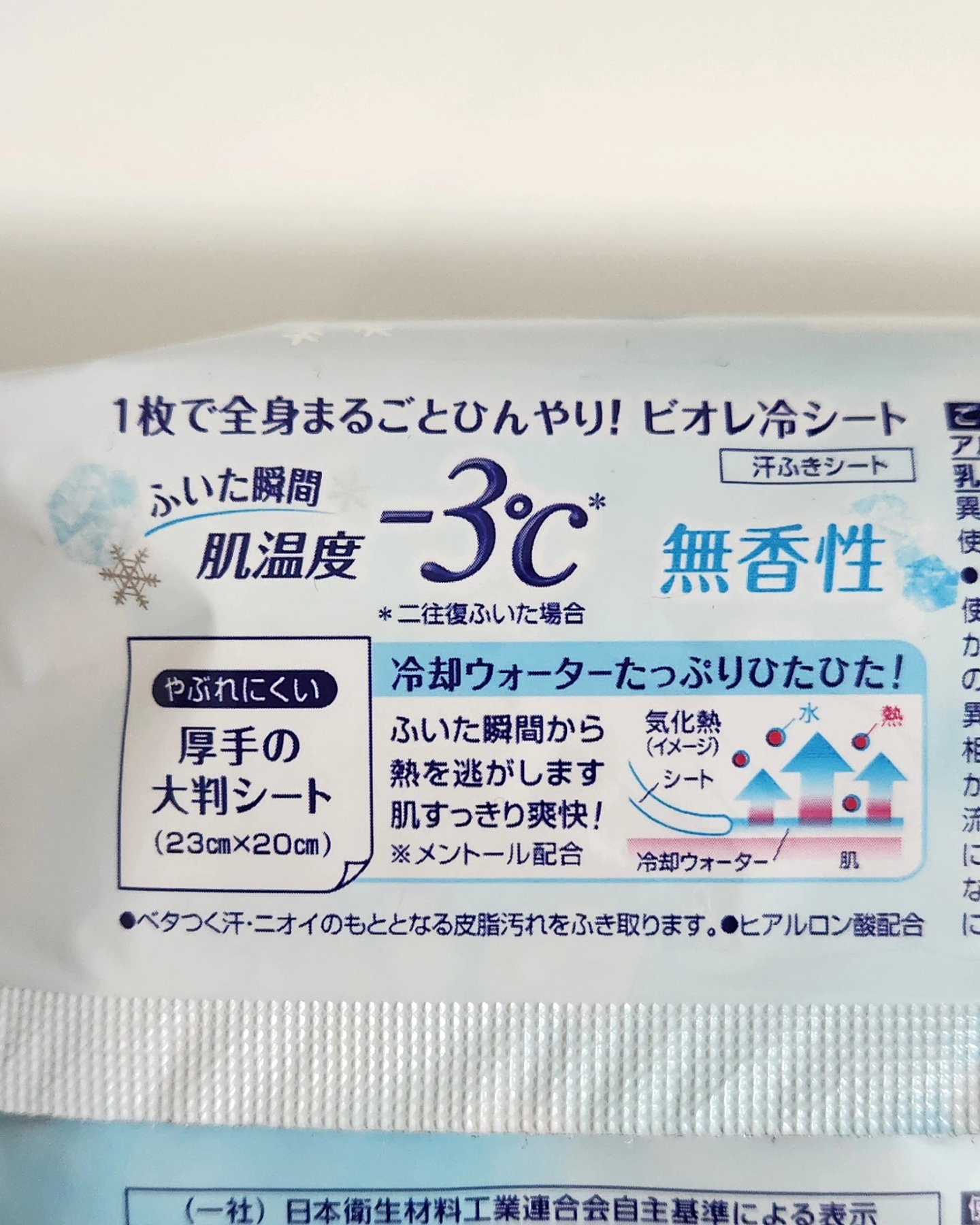 - ふいた瞬間肌温度-3℃*1。 冷却ウォーターたっぷりひたひた!ふいた瞬間から熱を逃がします。 1枚で全身ふける!やぶれにくい厚手の大判シート*2。 ひんやり感続く!メントール配合。 ●ベタつく汗・ニオイのもととなる皮脂汚れをふきとります ●天然コットン使用でやさしい肌触り ●ヒアルロン酸配合 ●無香性 *1 二往復ふいた場合 *2 大きさ当社比3倍