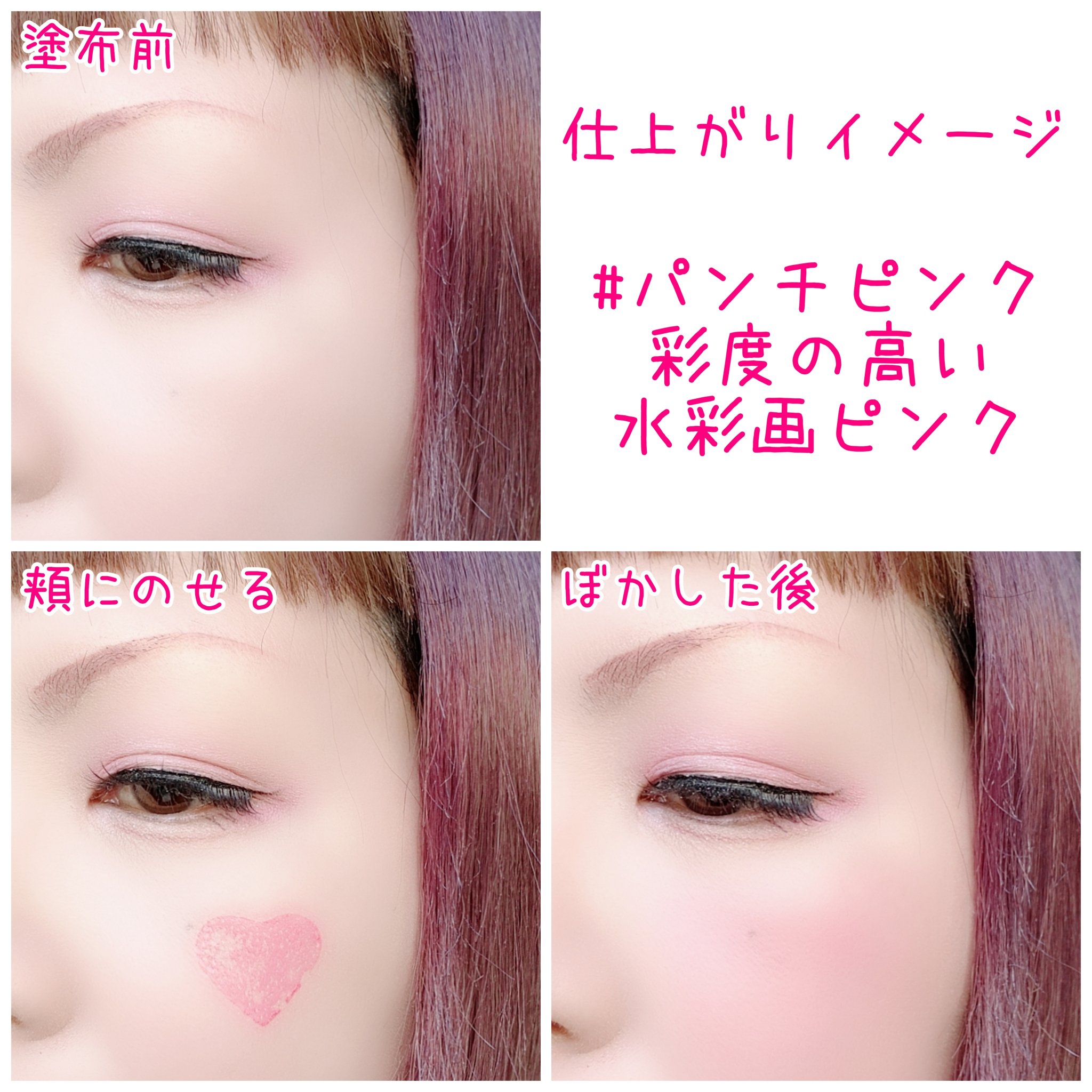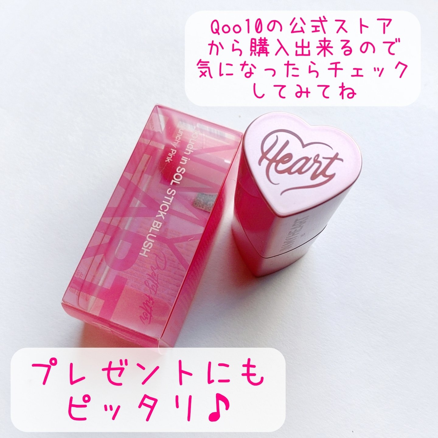 ハート型のスティックチーク! なめらかなテクスチャーでしっとり密着♡ 色ムラになりにくく使いやすいよ✨ パンチピンクは彩度の高い水彩画ピンク! 高発色でぼかしやすいく、色持ちも良き! じゅんわり滲み出たような色ツヤで ほてりメイクにピッタリ♪