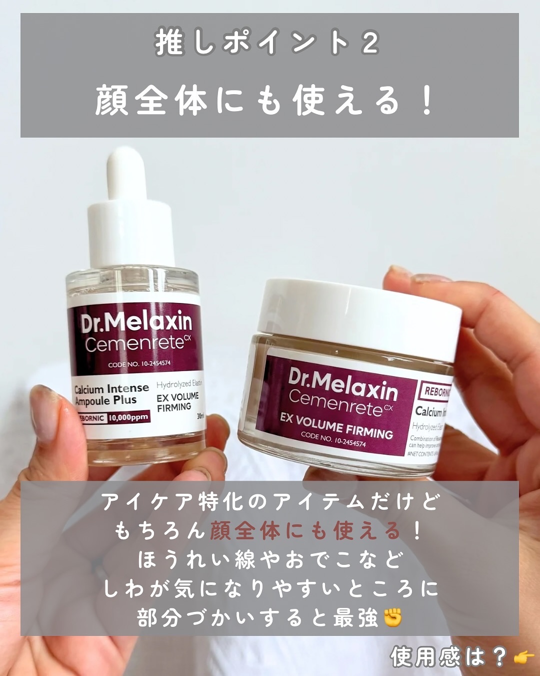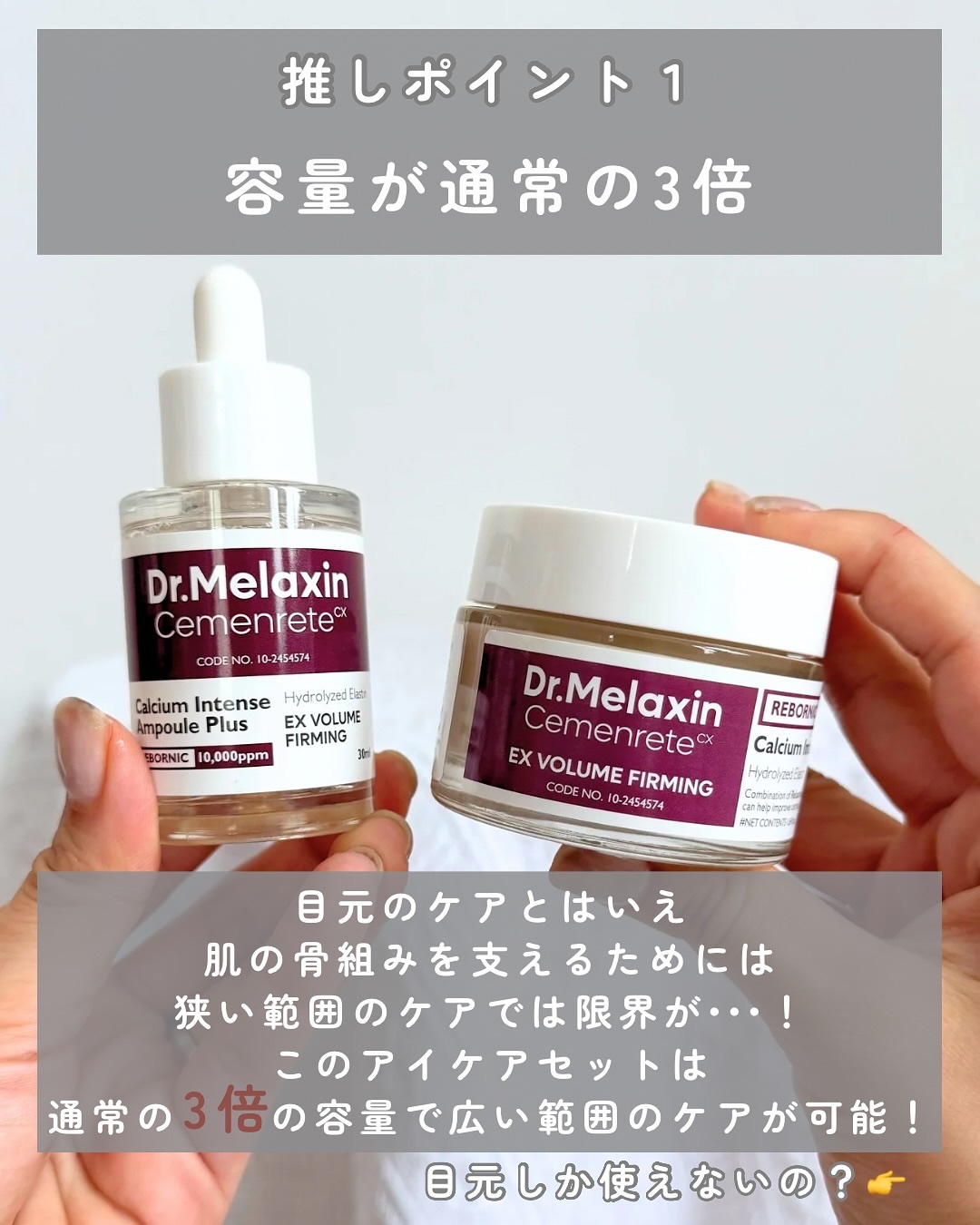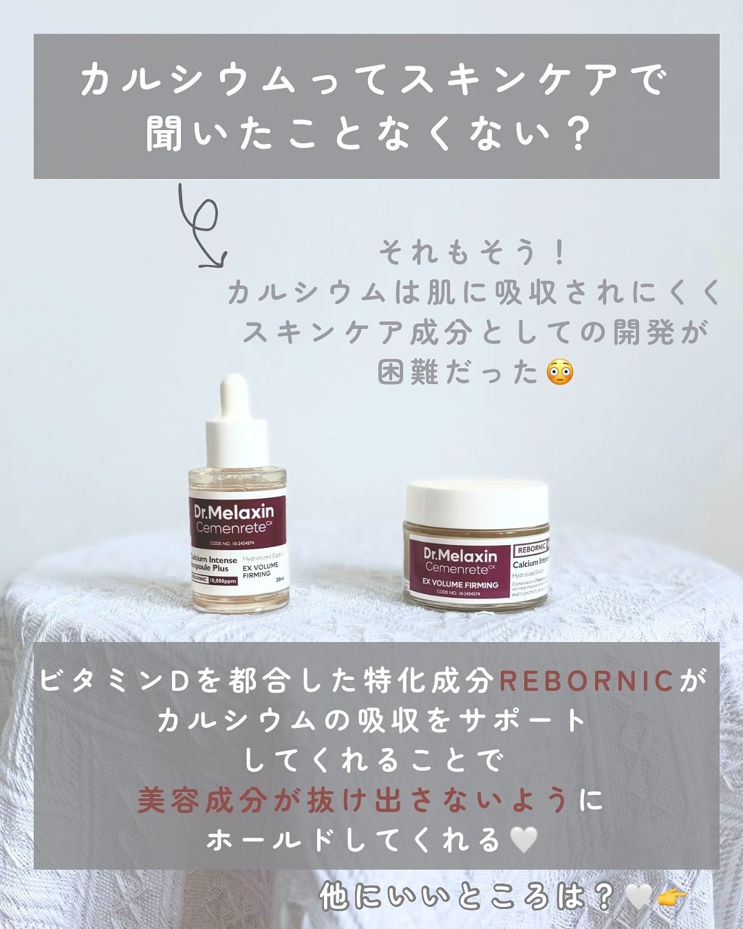 目元ケアにはコラーゲンだけでは足りないんだって😦 カルシウムで肌の骨組みをしっかりと支え、くぼんだ目元をリフティングすることでハリ、弾力をチャージするというセメンリトライン✨ 特化型成分REBORNIC(リボーニック)がカルシウムの浸透力を高め、抜け出さないようホールドしてくれるんだそう🤍