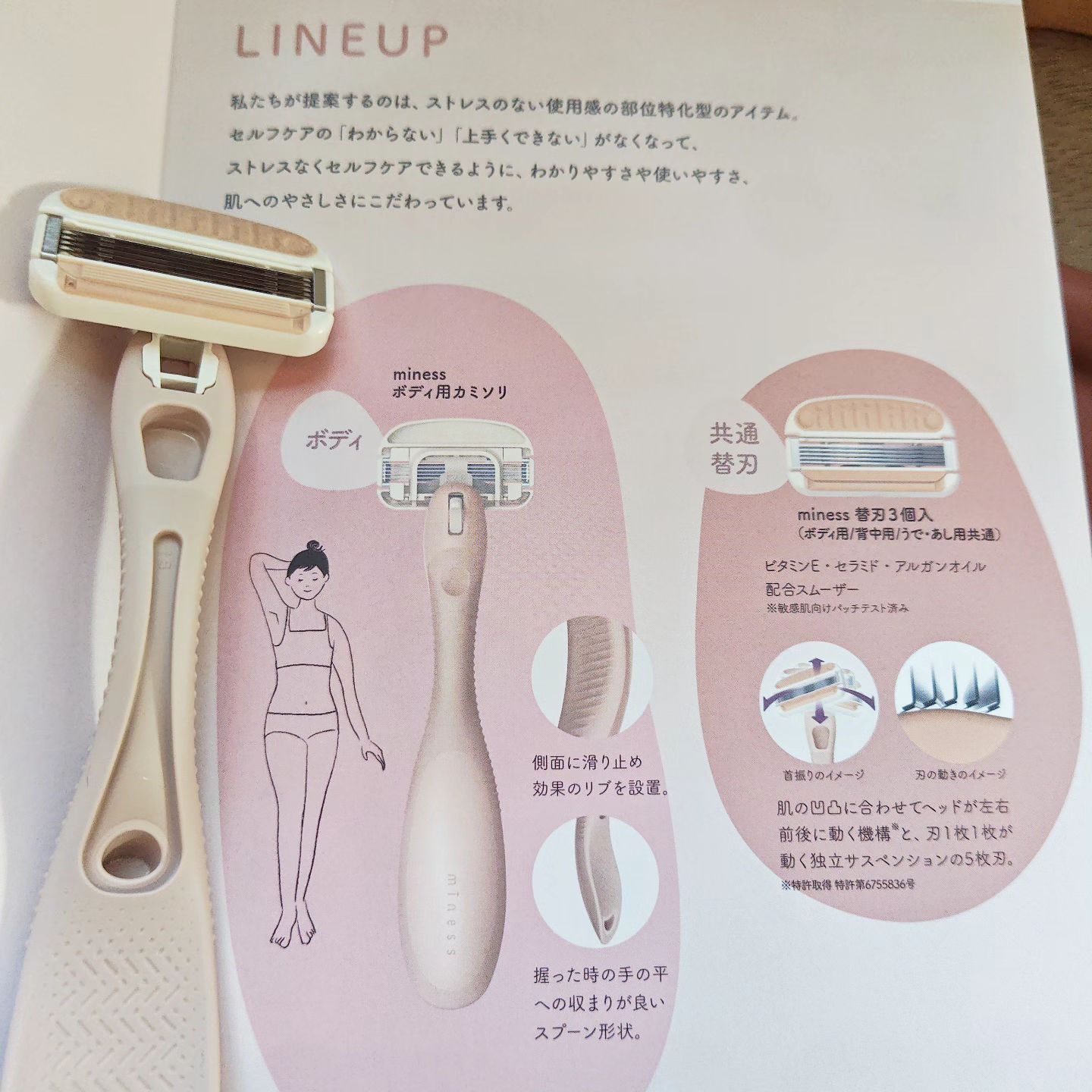 - ストレスのない使用感を追求した部位特化型のブランド セルフケアの「わからない」「上手くできない」がなくなるように、わかりやすさや使いやすさ、肌へのやさしさにこだわりました。 ・オールマイティなボディ用 ・刃部は肌の凹凸に合わせてヘッドが左右前後に動く首振り機構※1と、刃1枚1枚が動く独立サスペンションの5枚刃(シームレスフィッティングシステム®) ・握った時の手の平への収まりが良いスプーン形状※2 ・ビタミンE・セラミド・アルガンオイル配合スムーザー※3 ・置いた時に刃が接地しないので、清潔に保管できる ・側面に滑り止め効果のリブ形状を設置 ・替刃は背中用カミソリ、うで・あし用カミソリとの互換性あり ※1 特許取得 特許第6755836号 ※2 意匠権取得 意匠登録第1752449号 ※3 敏感肌向けパッチテスト済み (すべての方に皮膚刺激が発生しないということではありません)