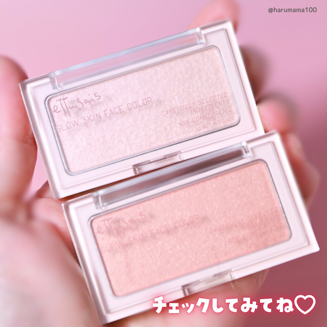 エテュセのフェイスカラー、待ってましたー!! もうね、ほんとうに使用感がよかった✨ うるおいが長時間続くスキンケア仕立てでテクスチャーだけでなく肌もしっとりが続く🫧 01 なじみつやハイライト 繊細な輝きでうるおったツヤ肌を演出 白浮しないピンクベージュ♡