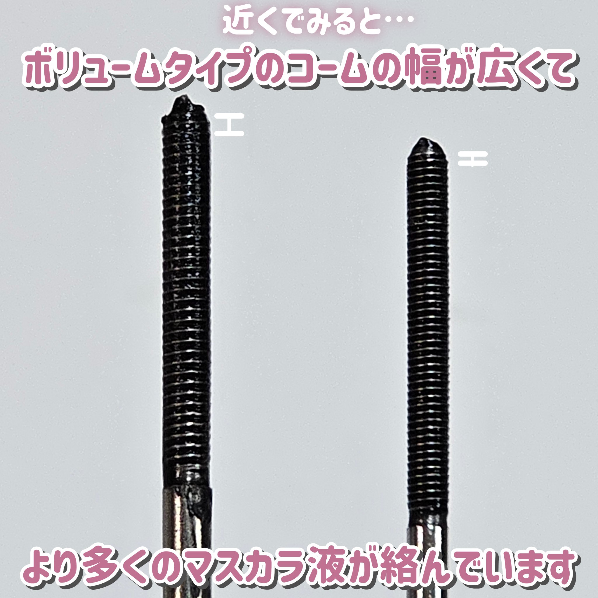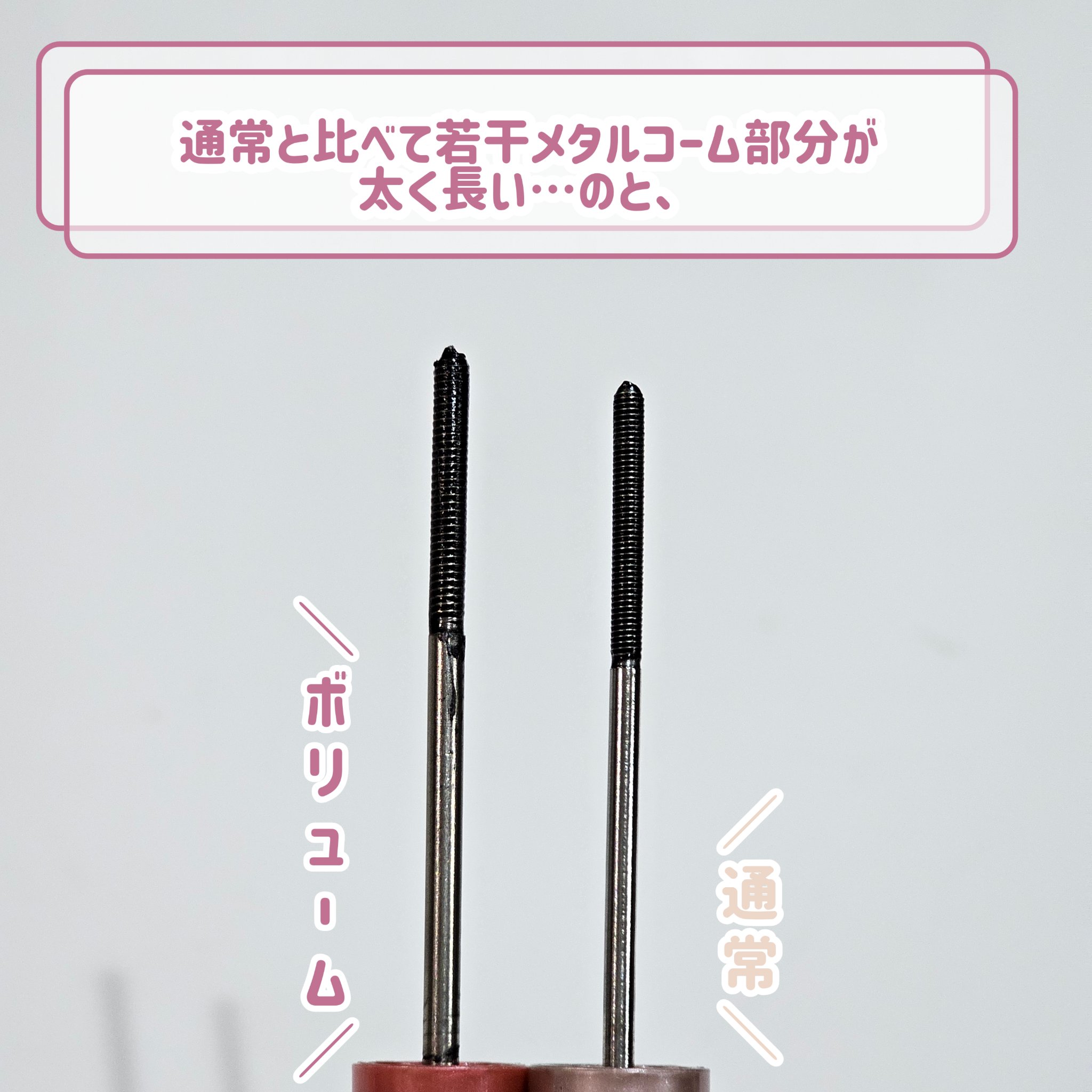 メタルックマスカラのボリュームタイプ。ピッチが幅広になってるよ。 普通のメタルックよりはもっとしっかり液がついてボリュームがでる印象。 重ねれば重ねるほど自分好みの束感が作れるのも良いですね。