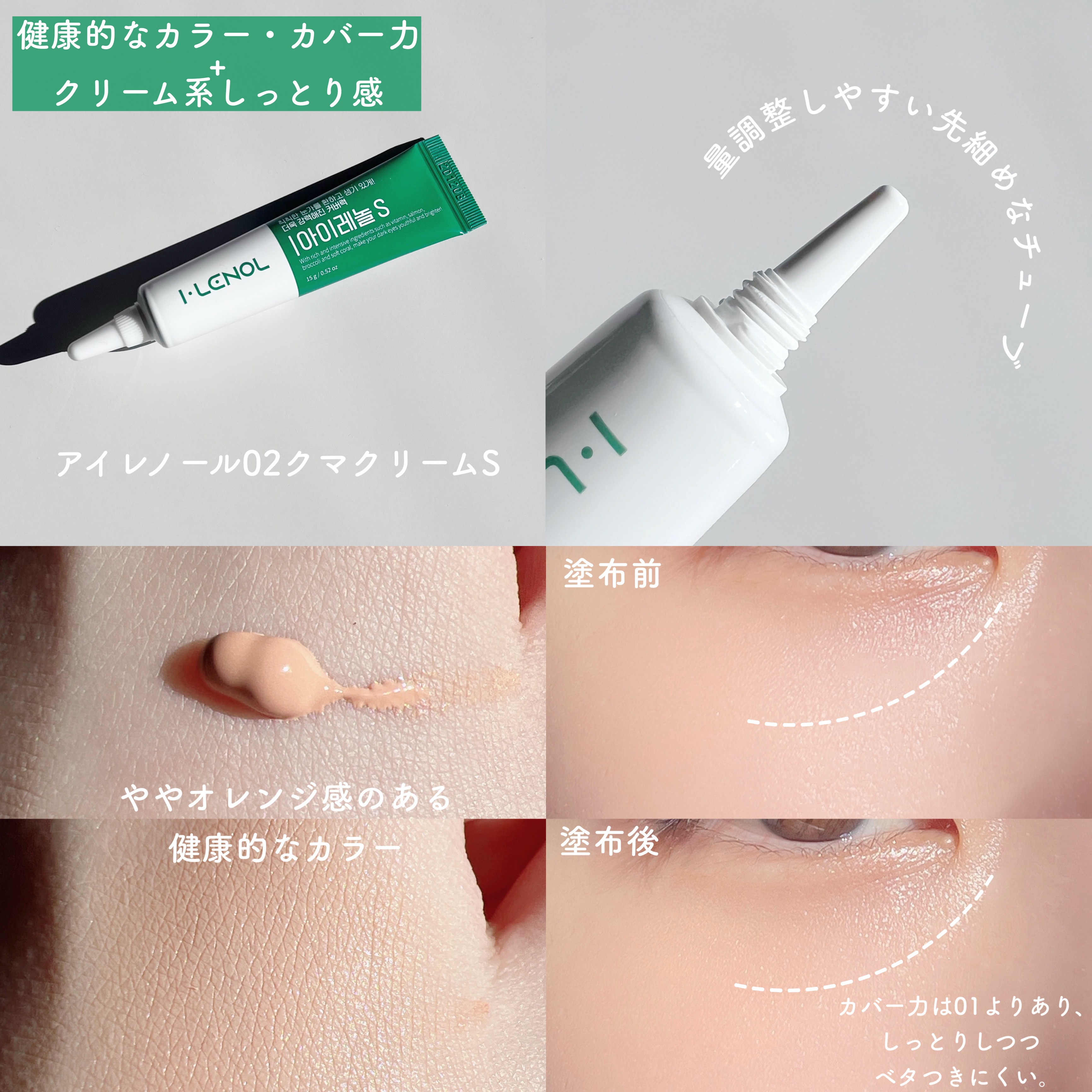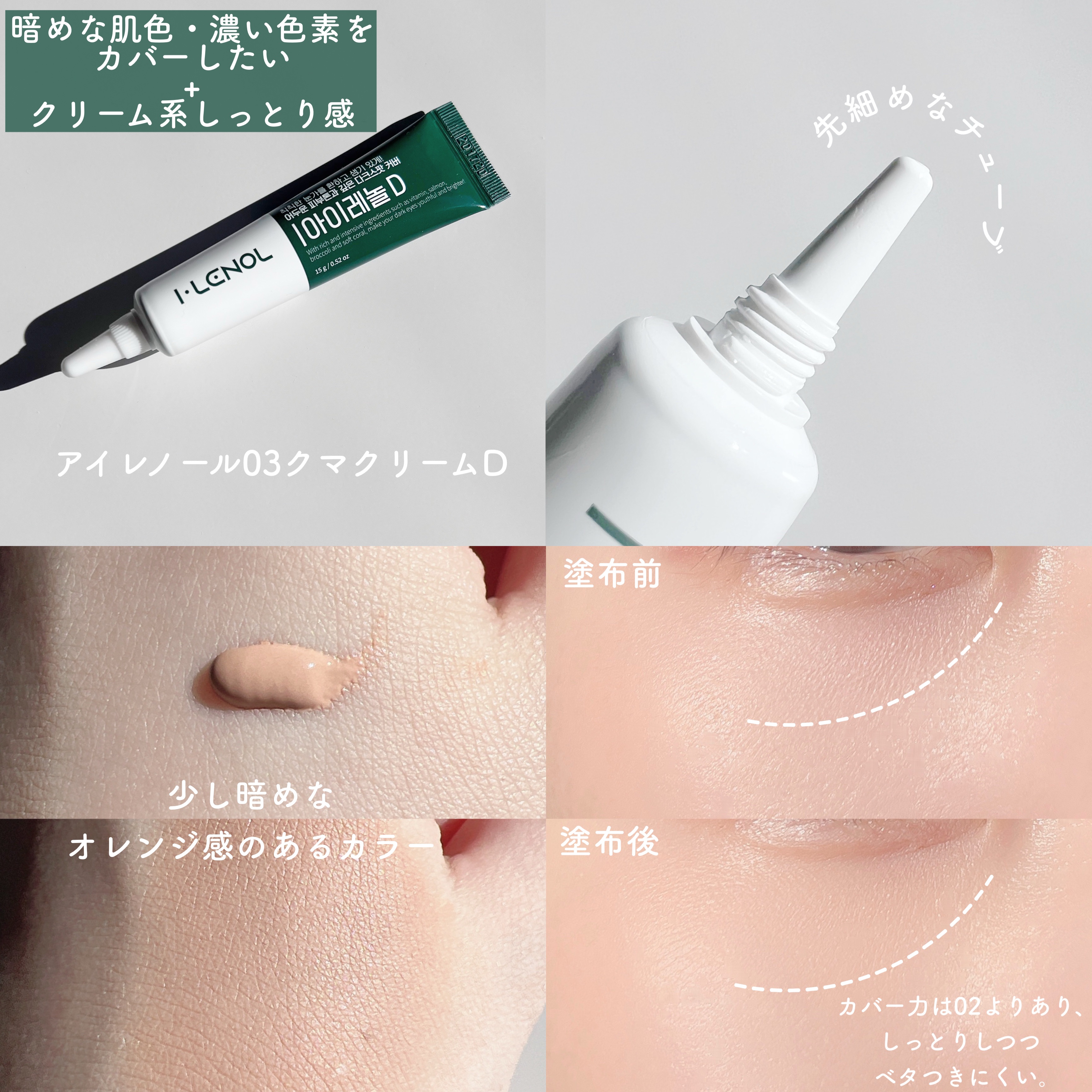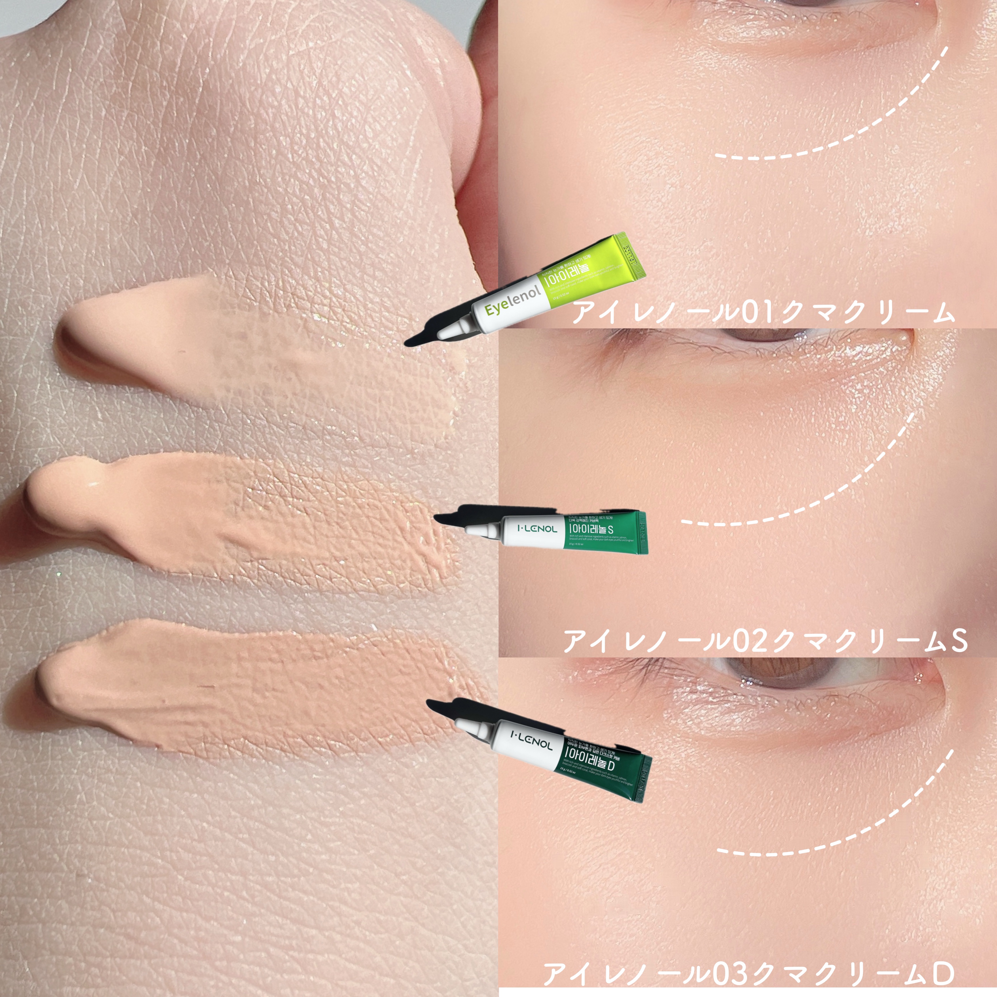 - <アイレノール クマクリーム> 水、シクロペンタシロキサン、グリセリン、ナイアシンアミド、ツボクサ葉エキス、サンゴエキス、パンテノール、イソヘキサデカン、ヒドロキシエチルウレア、ジメチコノール、アラントイン、グリチルリチン酸2K、プロパンジオール、カプリルヒドロキサム酸、香料、オリーブ果実油、酢酸トコフェロール、ホホバ種子油、オレイン酸ソルビタン、アルガニアスピノサ核油、アデノシン、エチルヘキシルグリセリン、プルラン、ヒアルロン酸Na、EDTA-2Na、トリデセス-6、DNA-Na、(アクリル酸グリセリル/アクリル酸)コポリマー、リノール酸グリセリル、ペンチレングリコール、リノレン酸グリセリル、アラキドン酸グリセリル、パルミチン酸レチノール、ラウリン酸K、ピーナッツ油、ヒアルロン酸クロスポリマーNa、トマト果実エキス、ブロッコリーエキス、ケール葉エキス、キャベツ葉エキス、チャ葉エキス、レモン果実エキス、アスパラガスエキス、フラガリアチロエンシス果実エキス、カキ葉エキス、トウガラシ果実エキス、水溶性プロテオグリカン、アスタキサンチン、ヒアルロン酸、トコフェロール、パルミチン酸アスコルビル、酸化チタン、酸化鉄、他 <アイレノール クマクリームS> 水、シクロペンタシロキサン、グリセリン、ナイアシンアミド、ツボクサ葉エキス、サンゴエキス、パンテノール、イソヘキサデカン、ヒドロキシエチルウレア、ジメチコノール、アラントイン、グリチルリチン酸2K、プロパンジオール、カプリルヒドロキサム酸、香料、オリーブ果実油、酢酸トコフェロール、ホホバ種子油、オレイン酸ソルビタン、アルガニアスピノサ核油、アデノシン、エチルヘキシルグリセリン、プルラン、ヒアルロン酸Na、EDTA-2Na、トリデセス-6、DNA-Na、(アクリル酸グリセリル/アクリル酸)コポリマー、リノール酸グリセリル、ペンチレングリコール、リノレン酸グリセリル、アラキドン酸グリセリル、パルミチン酸レチノール、ラウリン酸K、ピーナッツ油、ヒアルロン酸クロスポリマーNa、トマト果実エキス、ブロッコリーエキス、ケール葉エキス、キャベツ葉エキス、チャ葉エキス、レモン果実エキス、アスパラガスエキス、フラガリアチロエンシス果実エキス、カキ葉エキス、トウガラシ果実エキス、水溶性プロテオグリカン、アスタキサンチン、ヒアルロン酸、トコフェロール、パルミチン酸アスコルビル、酸化チタン、酸化鉄、他