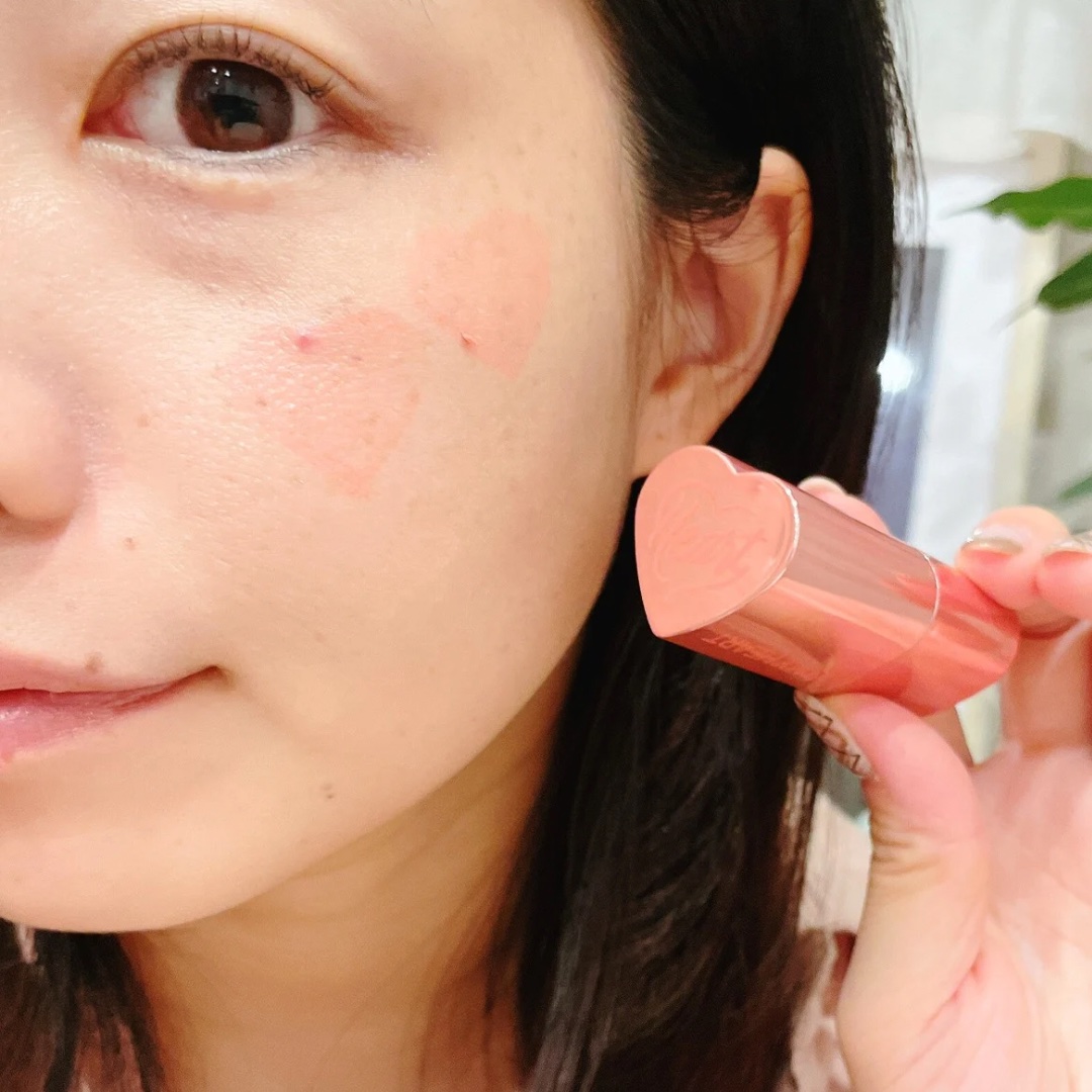 ハート型が可愛いスティックチーク クルクル繰り出して使うよ ポンとスタンプみたいに頬に押して指で馴染ませるとふわっとチークの完成☺️ 選んだカラーはサンセットコーラル🌇 付けた時はちょっと色味強い?と思ったけどぼかしたら可愛いオレンジピンクだった🧡 クリーミーで粉っぽさもないから乾燥せずに過ごせたよ 密着も良くて落ちない!
