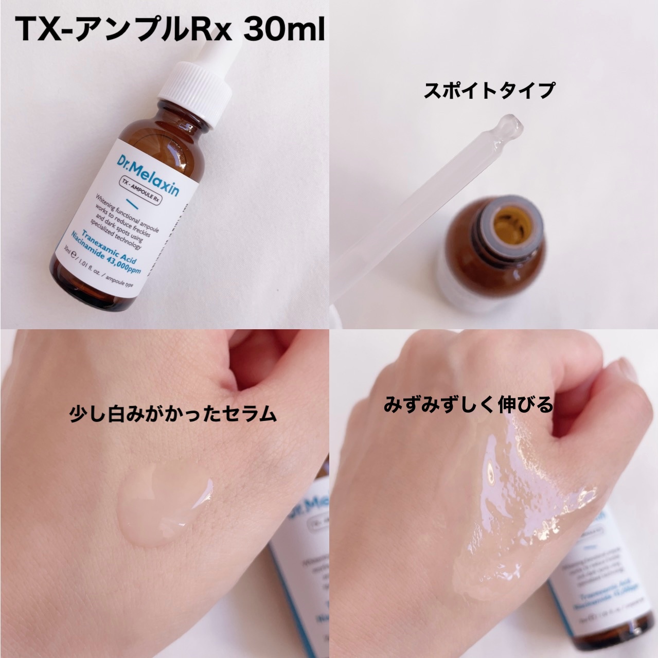 べたつかずさらっとしたテクスチャで季節を問わず年中使用可能! ドクターメラクチンはトラネキサム酸をナノリポソーム化しより吸収させやすくするスキンケアトラネキサム酸(TX)1美肌ラインを開発 アンプルは伸びがよく、少しとろみがあって塗りやすかったです!