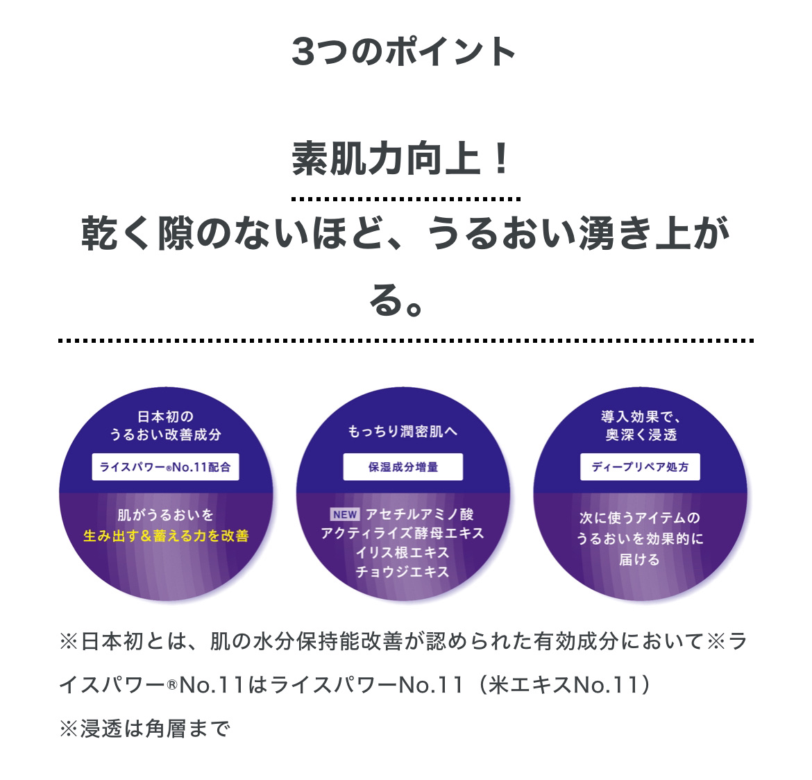 - <60ml> 有効成分 ライスパワーNo.11(米エキスNo.11) その他の成分 精製水、1,3-ブチレングリコール、エタノール、濃グリセリン、ジグリセリン、N-アセチル-L-ヒドロキシプロリン、アセチル化ヒアルロン酸ナトリウム、イリス根エキス、カンゾウ葉エキス、チョウジエキス、酵母エキス(1)、天然ビタミンE、2-オクチルドデカノール、エデト酸二ナトリウム、キサンタンガム、クエン酸、シクロヘキサンジカルボン酸ビスエトキシジグリコール、ジェランガム、テトラオレイン酸ポリオキシエチレンソルビット、ピロ亜硫酸ナトリウム、ポリオキシエチレンコレステリルエーテル、ポリオキシエチレン硬化ヒマシ油、リン酸一水素ナトリウム、植物性スクワラン、無水エタノール、フェノキシエタノール、メチルパラベン、香料 <限定ラージサイズ 120ml> 有効成分 ライスパワーNo.11(米エキスNo.11) その他の成分 精製水、1,3-ブチレングリコール、エタノール、濃グリセリン、ジグリセリン、N-アセチル-L-ヒドロキシプロリン、アセチル化ヒアルロン酸ナトリウム、イリス根エキス、カンゾウ葉エキス、チョウジエキス、酵母エキス(1)、天然ビタミンE、2-オクチルドデカノール、エデト酸二ナトリウム、キサンタンガム、クエン酸、シクロヘキサンジカルボン酸ビスエトキシジグリコール、ジェランガム、テトラオレイン酸ポリオキシエチレンソルビット、ピロ亜硫酸ナトリウム、ポリオキシエチレンコレステリルエーテル、ポリオキシエチレン硬化ヒマシ油、リン酸一水素ナトリウム、植物性スクワラン、無水エタノール、フェノキシエタノール、メチルパラベン、香料 <付けかえ用 60ml> 有効成分 ライスパワーNo.11(米エキスNo.11) その他の成分 精製水、1,3-ブチレングリコール、エタノール、濃グリセリン、ジグリセリン、N-アセチル-L-ヒドロキシプロリン、アセチル化ヒアルロン酸ナトリウム、イリス根エキス、カンゾウ葉エキス、チョウジエキス、酵母エキス(1)、天然ビタミンE、2-オクチルドデカノール、エデト酸二ナトリウム、キサンタンガム、クエン酸、シクロヘキサンジカルボン酸ビスエトキシジグリコール、ジェランガム、テトラオレイン酸ポリオキシエチレンソルビット、ピロ亜硫酸ナトリウム、ポリオキシエチレンコレステリルエーテル、ポリオキシエチレン硬化ヒマシ油、リン酸一水素ナトリウム、植物性スクワラン、無水エタノール、フェノキシエタノール、メチルパラベン、香料 <ラージサイズ 付けかえ用 120ml> 有効成分 ライスパワーNo.11(米エキスNo.11) その他の成分 精製水、1,3-ブチレングリコール、エタノール、濃グリセリン、ジグリセリン、N-アセチル-L-ヒドロキシプロリン、アセチル化ヒアルロン酸ナトリウム、イリス根エキス、カンゾウ葉エキス、チョウジエキス、酵母エキス(1)、天然ビタミンE、2-オクチルドデカノール、エデト酸二ナトリウム、キサンタンガム、クエン酸、シクロヘキサンジカルボン酸ビスエトキシジグリコール、ジェランガム、テトラオレイン酸ポリオキシエチレンソルビット、ピロ亜硫酸ナトリウム、ポリオキシエチレンコレステリルエーテル、ポリオキシエチレン硬化ヒマシ油、リン酸一水素ナトリウム、植物性スクワラン、無水エタノール、フェノキシエタノール、メチルパラベン、香料 <14mL> 有効成分 ライスパワーNo.11(米エキスNo.11) その他の成分 精製水、1,3-ブチレングリコール、エタノール、濃グリセリン、ジグリセリン、N-アセチル-L-ヒドロキシプロリン、アセチル化ヒアルロン酸ナトリウム、イリス根エキス、カンゾウ葉エキス、チョウジエキス、酵母エキス(1)、天然ビタミンE、2-オクチルドデカノール、エデト酸二ナトリウム、キサンタンガム、クエン酸、シクロヘキサンジカルボン酸ビスエトキシジグリコール、ジェランガム、テトラオレイン酸ポリオキシエチレンソルビット、ピロ亜硫酸ナトリウム、ポリオキシエチレンコレステリルエーテル、ポリオキシエチレン硬化ヒマシ油、リン酸一水素ナトリウム、植物性スクワラン、無水エタノール、フェノキシエタノール、メチルパラベン、香料 <10mL(ミニサイズ)> 有効成分 ライスパワーNo.11(米エキスNo.11) その他の成分 精製水、1,3-ブチレングリコール、エタノール、濃グリセリン、ジグリセリン、N-アセチル-L-ヒドロキシプロリン、アセチル化ヒアルロン酸ナトリウム、イリス根エキス、カンゾウ葉エキス、チョウジエキス、酵母エキス(1)、天然ビタミンE、2-オクチルドデカノール、エデト酸二ナトリウム、キサンタンガム、クエン酸、シクロヘキサンジカルボン酸ビスエトキシジグリコール、ジェランガム、テトラオレイン酸ポリオキシエチレンソルビット、ピロ亜硫酸ナトリウム、ポリオキシエチレンコレステリルエーテル、ポリオキシエチレン硬化ヒマシ油、リン酸一水素ナトリウム、植物性スクワラン、無水エタノール、フェノキシエタノール、メチルパラベン、香料