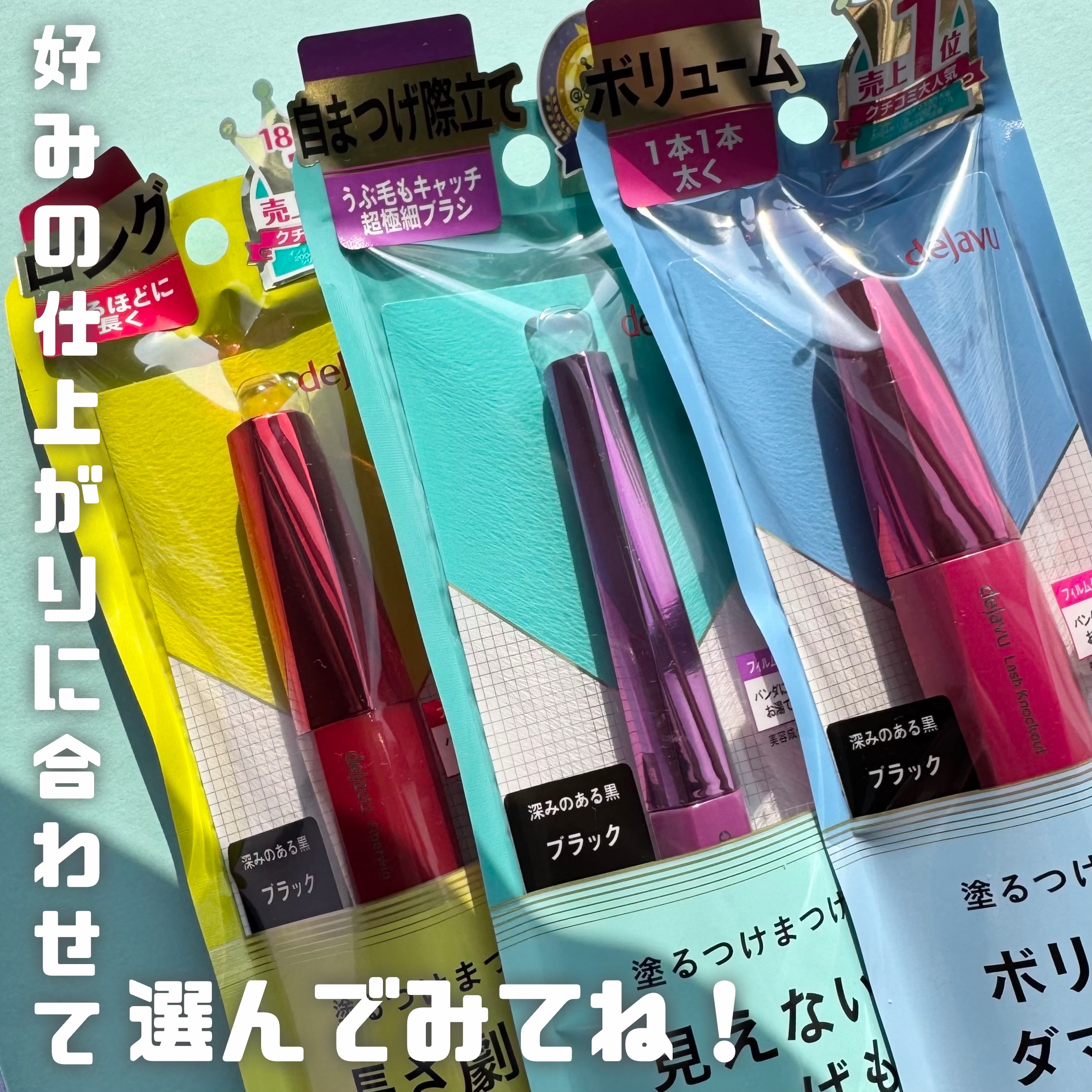 デジャヴュのマスカラは仕上がり別選べる3タイプ! ロングタイプ どこまでも塗るほどに長く! 自まつげ際立てタイプ!私の場合、下まつげが短くて細く、自分じゃ認識できないくらい薄い毛もあって‥ 極細ブラシだから瞼にも付きづらくて、塗りやすいよ👏目頭や目尻の毛にも!