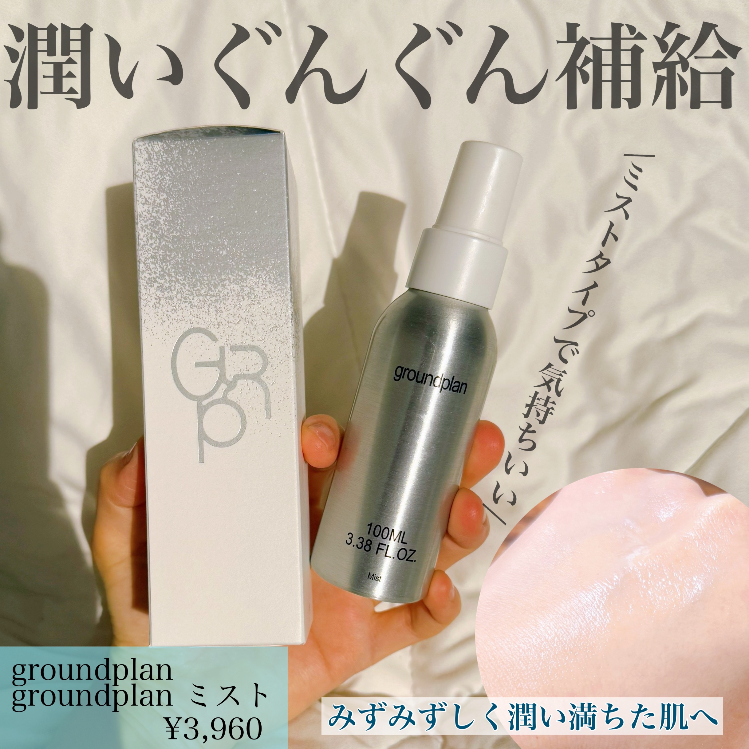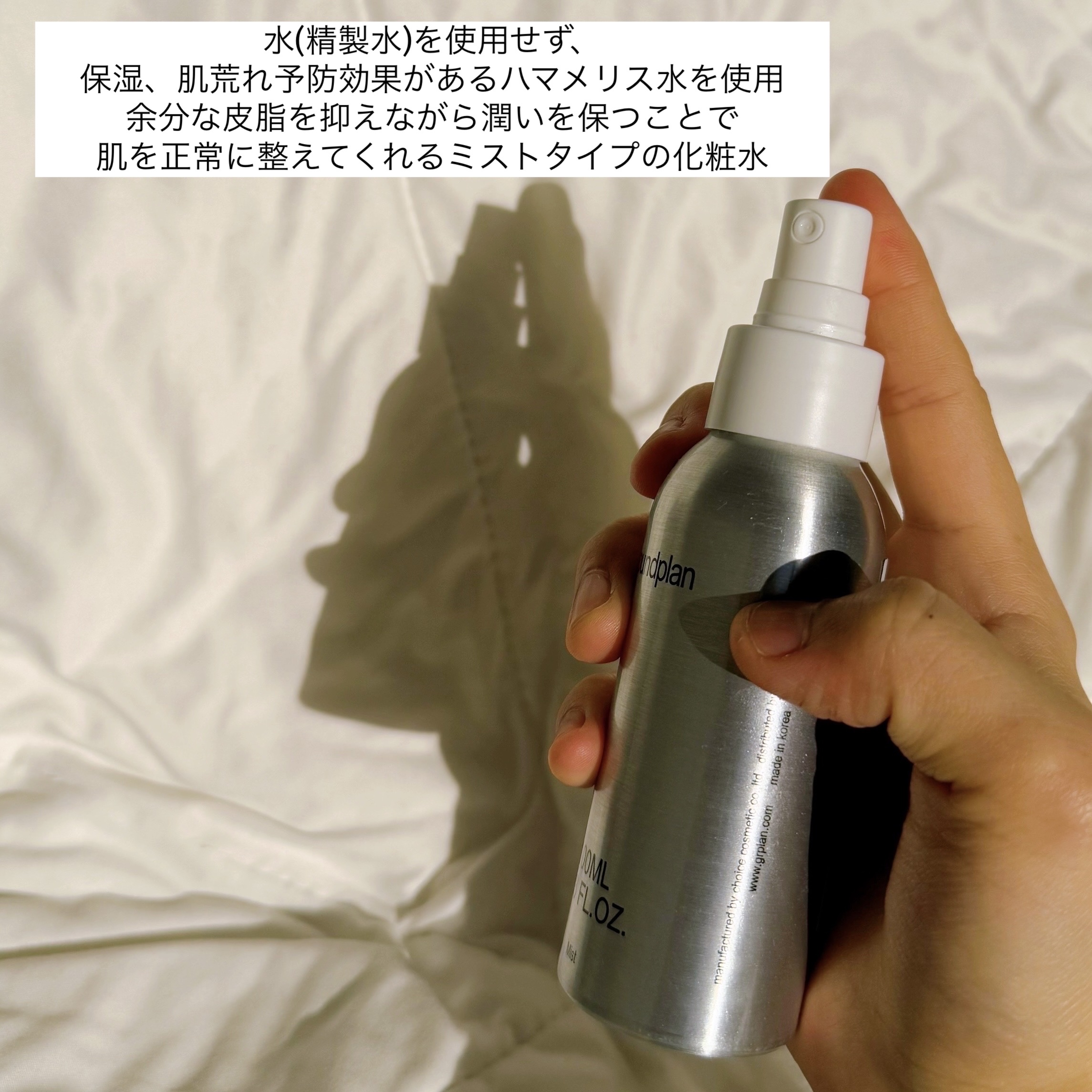 - 素早くうるおいをチャージするマルチ美容ミスト グラウンドプランを代表する製品、美容ミスト。 水(精製水)を使用せず保湿・肌荒れ予防効果があるハマメリス水を使用。余分な皮脂をケアしながら、うるおいを保つことで肌を健やかに保ちます。ヘアやボディにも。 簡単に吹きかけることで乾燥から肌を守り、潤いに満ちた肌へ。 □ ラベンダーの香り(合成香料不使用) -POINT- ① 水(精製水)を使用せず、代わりにハマメリス水を使用。みずみずしくキメの整った肌へ。 ② 美容液のように濃縮したエキスで、いつでも水分をチャージ。 ③ 敏感肌テスト・皮膚一次刺激性テスト皮膚バリア機能評価テスト・ドイツダーマテスト社認証済み(すべての人に皮膚刺激が起こらないことを保証するものではありません) 【使い方】 容器をよく振り、顔から30 ㎝程度離して顔全体に適量(3プッシュ程度)を塗布し、やさしくプッシングして肌になじませてください。 ※強くプッシュすると中身が勢いよく出る場合がありますのでご注意ください。 ※目や口を閉じてご使用ください。吸入しないようにご注意ください。